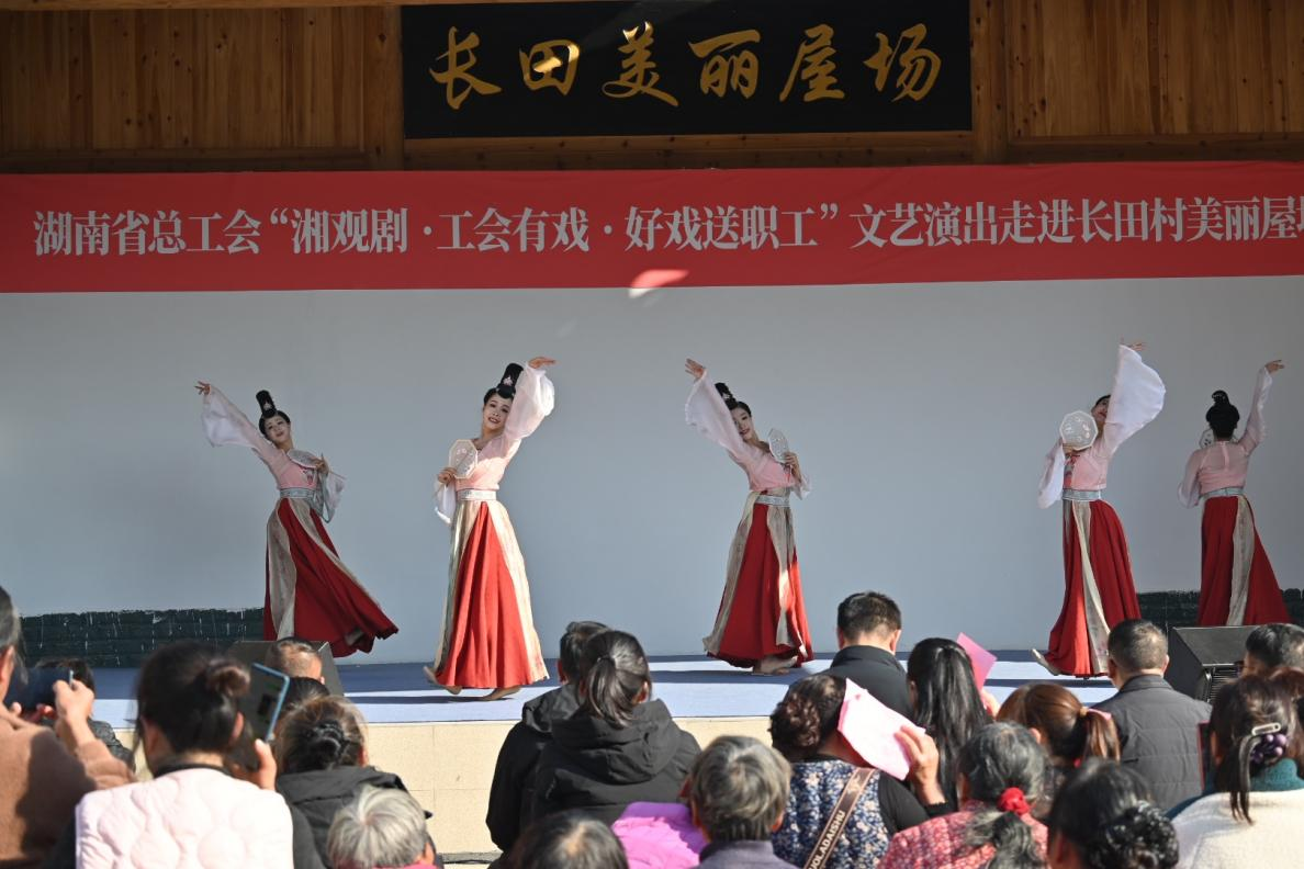 1月13日下午,阳光和煦,会同县若水镇长田村美丽屋场笑语盈盈。由湖南省总工会主办的“湘观剧·工会有戏·好戏送职工”文艺下乡活动温情上演,为当地村民送上接地气的文化盛宴。