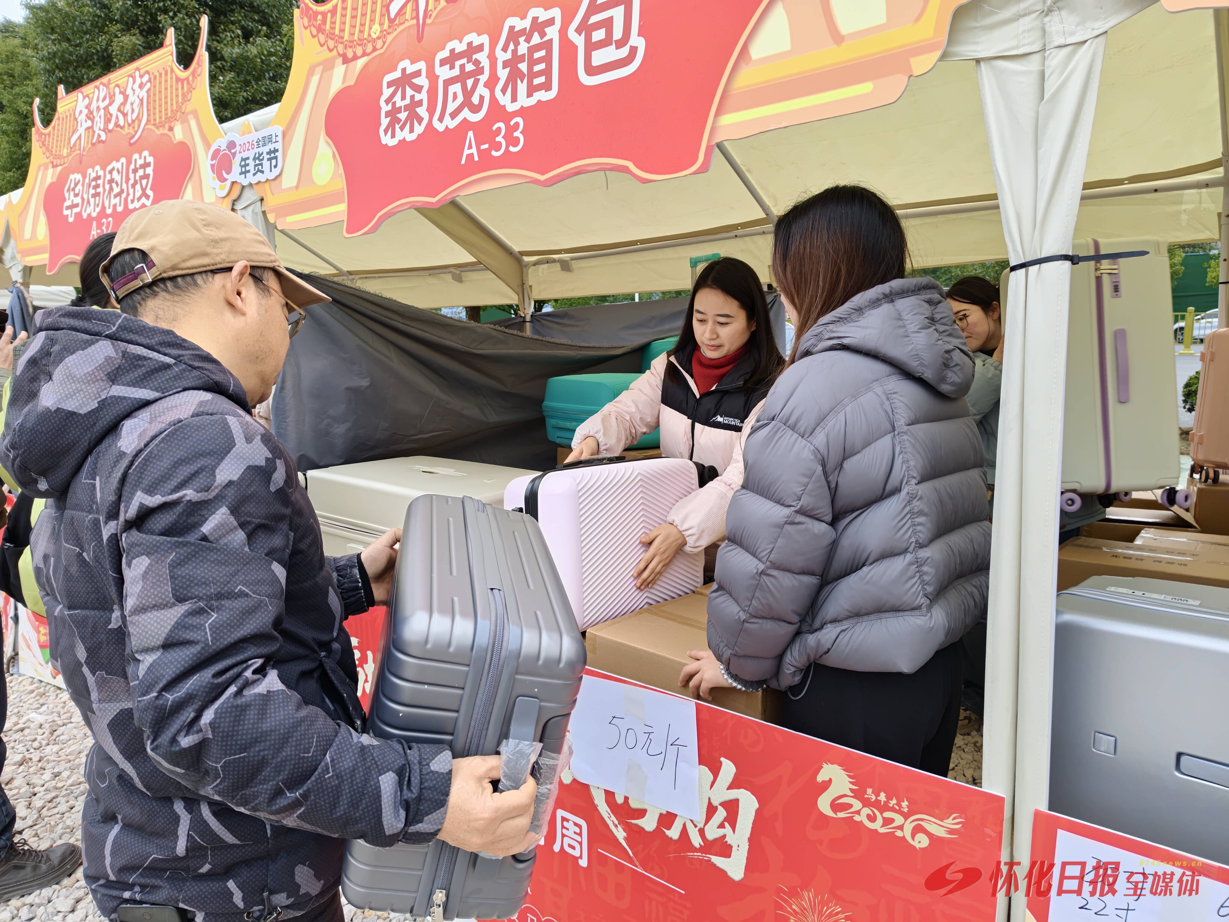 “我们是怀化本土的箱包企业,这也是我们第一次参加年货节。”湖南华炜科技有限公司冯品瑜介绍,本次带来了多款流行的行李箱,并以成本价出售,“在商场里要上千元的箱子,在这里只要两三百元就能买到。”