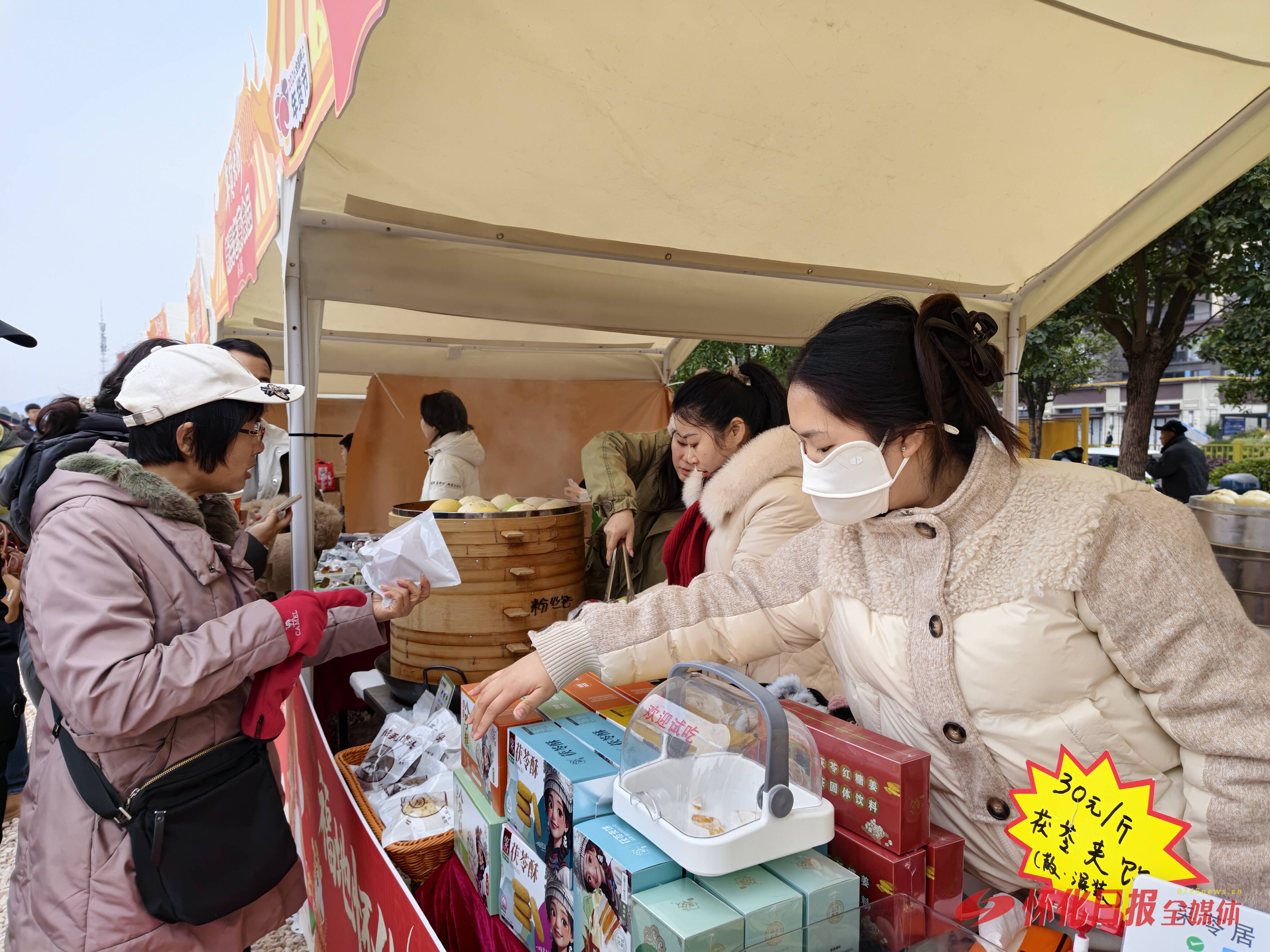 怀商特色年货区则集中了本地特产:腊鱼腊肉、冰糖橙、溆浦鹅、新晃牛肉干、靖州茯苓、芷江甜茶……