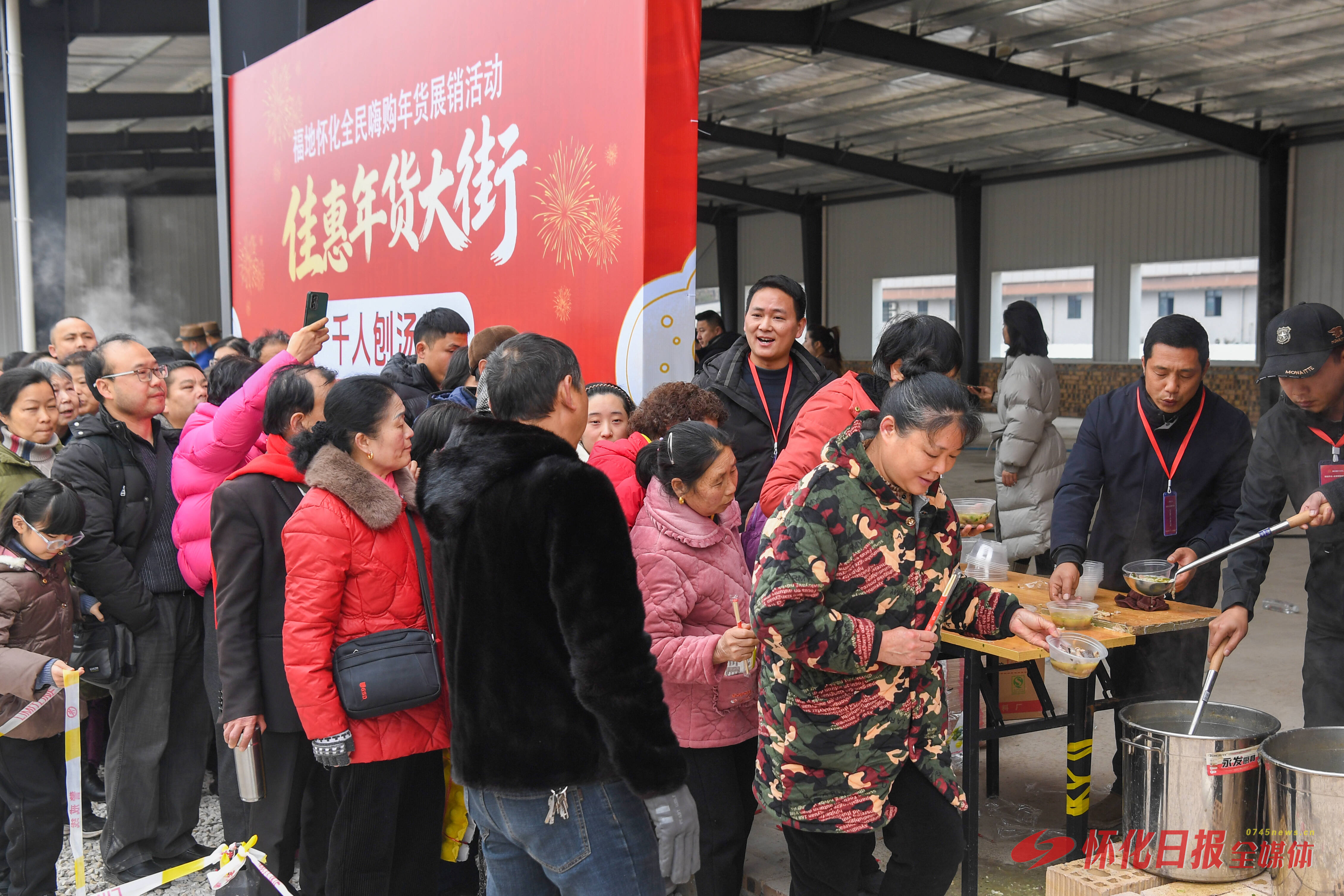 中午12点半,千人庖汤宴准时开席。热气腾腾农家庖汤在锅中翻滚,香气四溢。市民们排成长队,有序领取试吃。“我们组织动员了多家怀化知名餐饮品牌参与这次活动,每天提供一千余份免费庖汤,连续三天,让市民朋友们在购买年货的同时,品尝地道的怀化年味。”怀化市餐饮行业协会会长向方介绍。