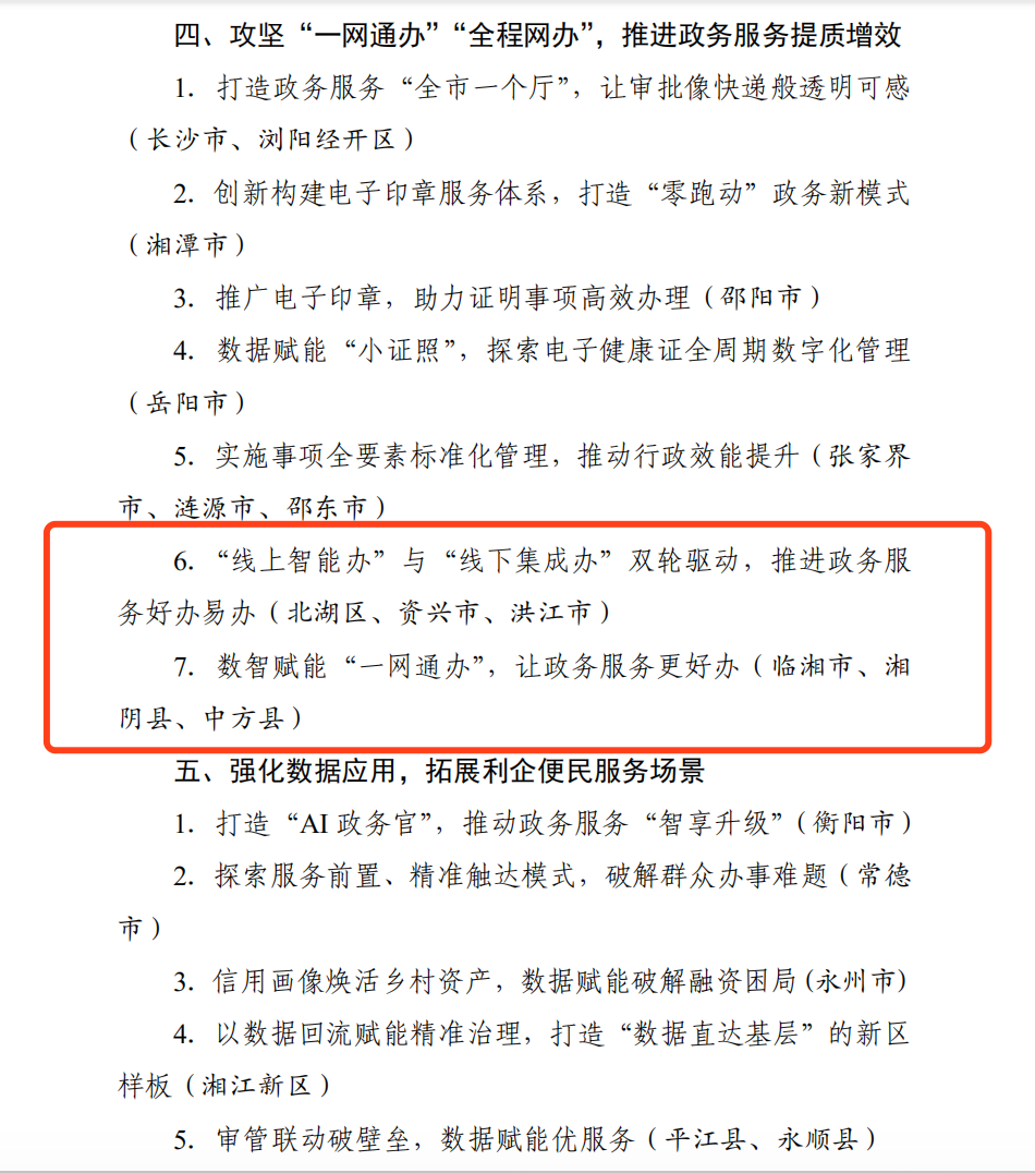 此次上榜的7项典型经验分别为:市本级创建的探索人才“一件事”,撬动区域发展“大动能”;芷江侗族自治县、新晃侗族自治县的探索数字赋能特色“一件事”,为县域经济发展注入活力;洪江市的“线上智能办”与“线下集成办”双轮驱动,推进政务服务好办易办;中方县的数智赋能“一网通办”,让政务服务更好办;会同县的探索智慧服务,提升政务服务满意度;沅陵县的推行阳光采购,推动财政资金降本增效。
