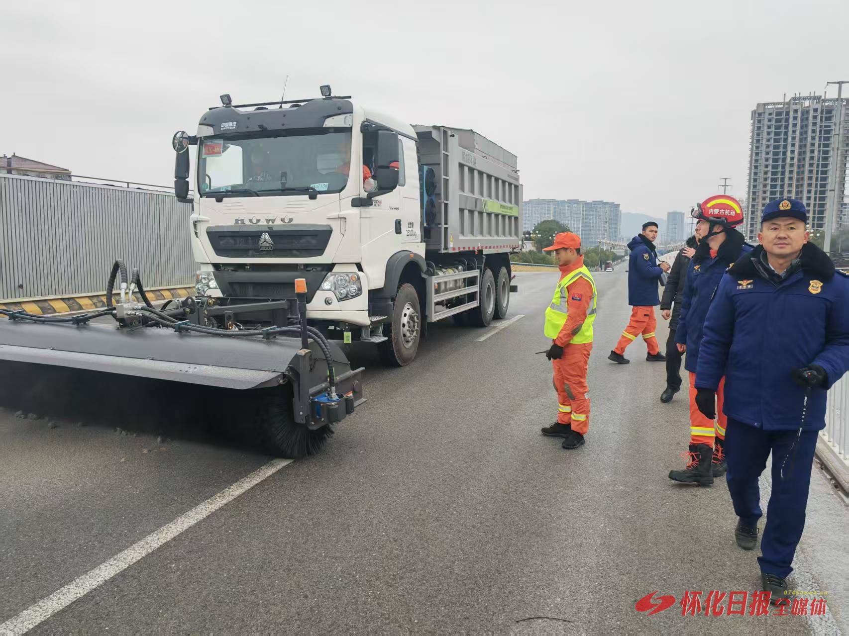 (1月21日,市应急、城管及长沙消防救援机动支队三大队在怀化人大天桥除冰作业。)