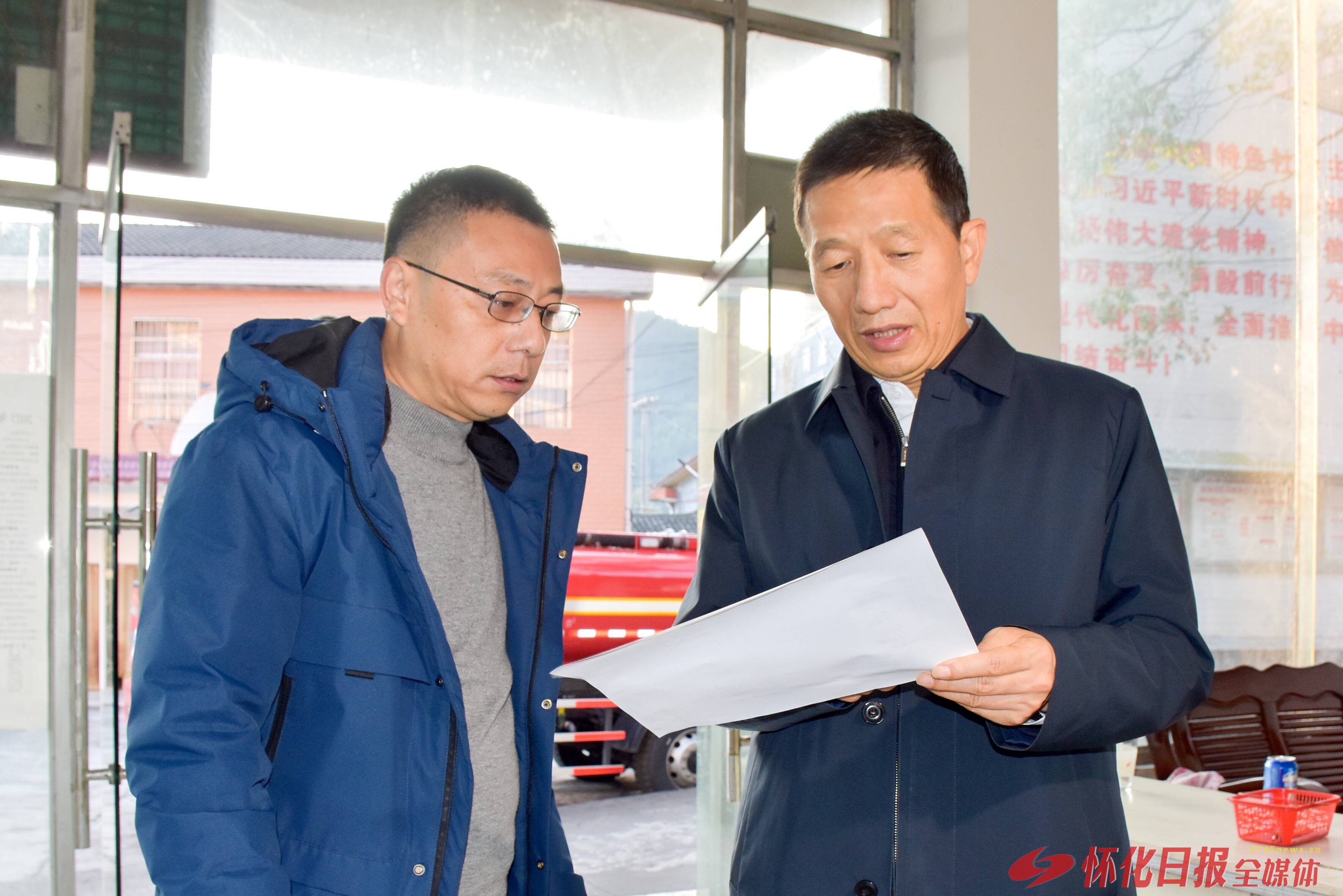 (1月7日下午,市委书记许忠建以“四不两直”方式,在麻阳和芷江的乡镇检查督导工作。图为许忠建在芷江牛牯坪乡政府,详细了解乡村振兴、安全生产、便民服务、值班值守等情况。 怀化日报全媒体记者 黄莎 摄)