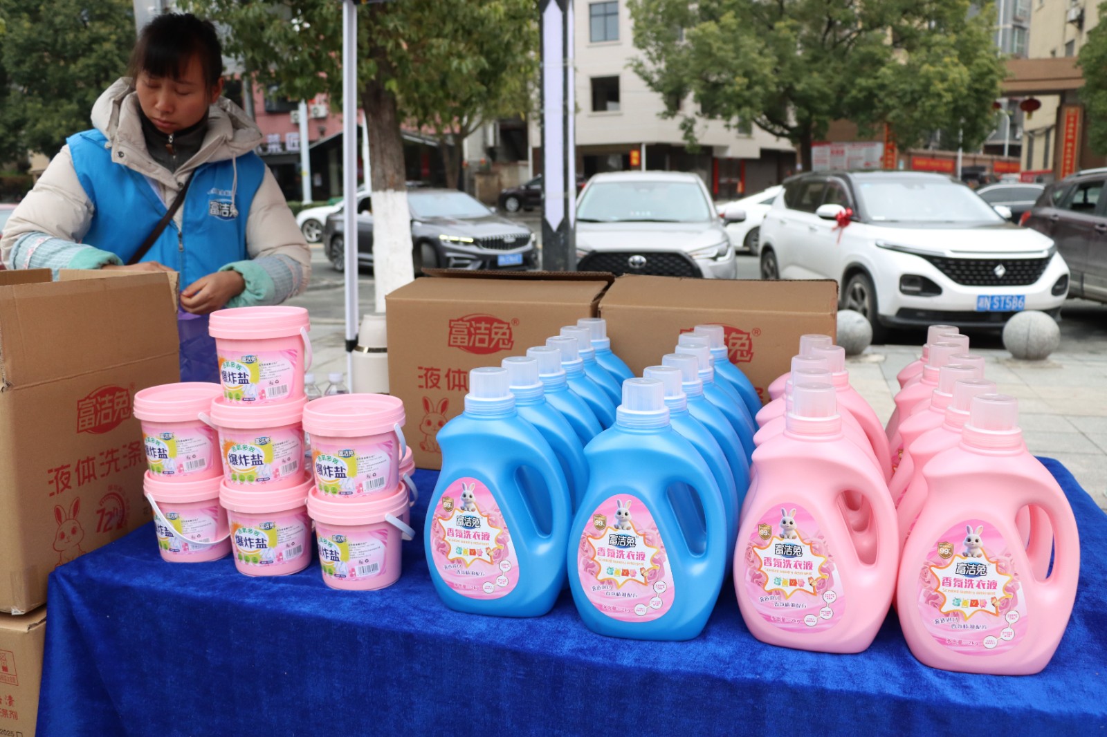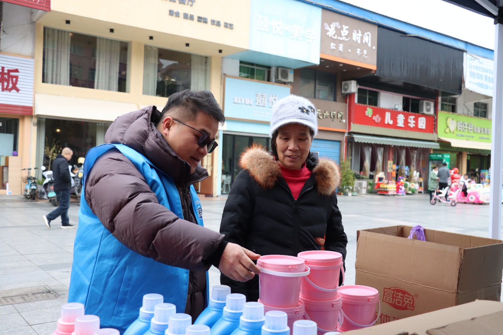 除了传统年货,摊位上也有本土创新产品。摊主李俊是从外地返乡创业的年轻人,他的厂子设在金竹镇。他拿着自家洗衣液向顾客介绍:“我们产品质量对标大品牌,价格更实惠,乡亲们可以放心用。”他表示,希望能借年货节推广本土产品,得到更多家乡人的支持。