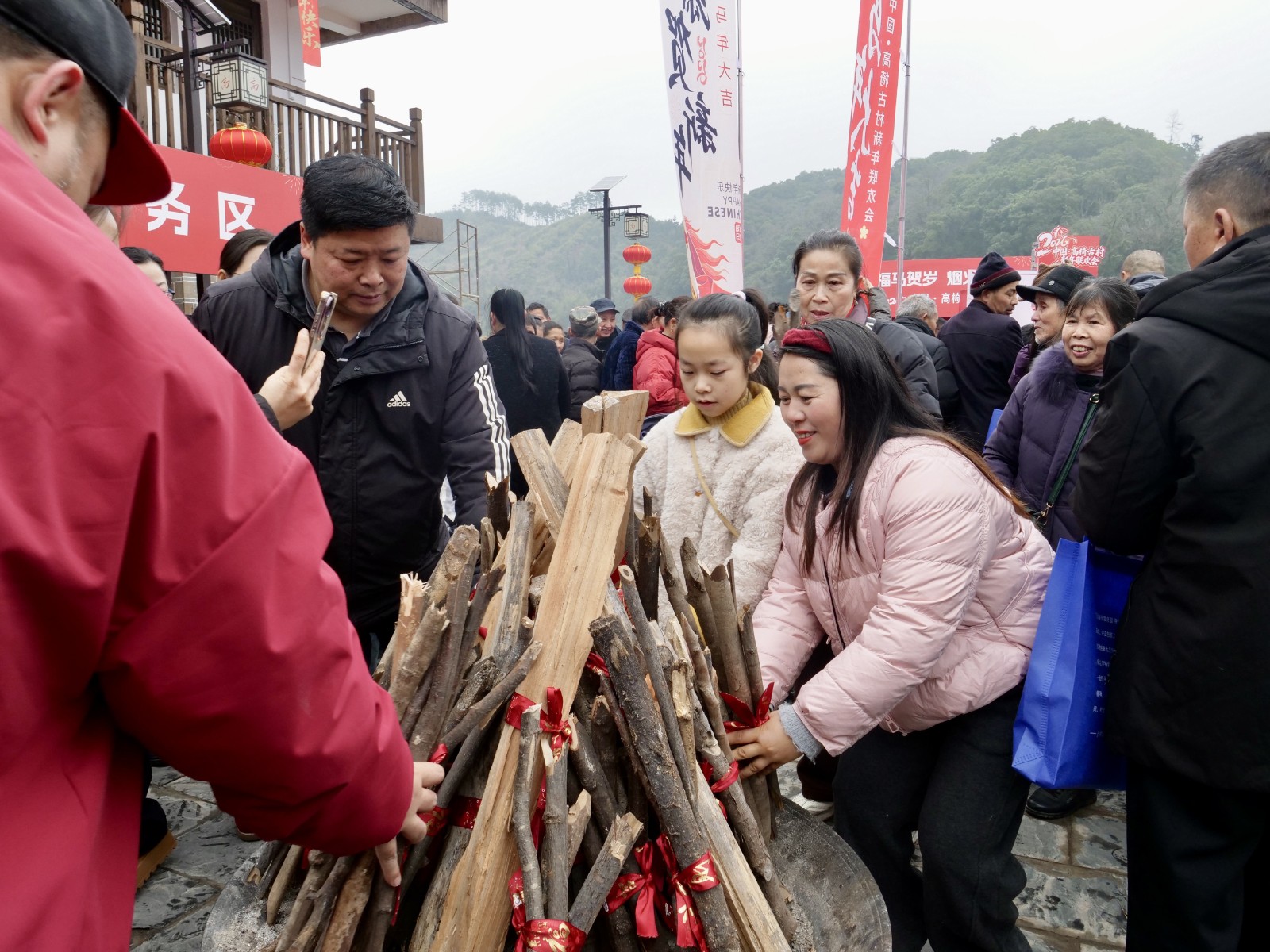 码头广场成了欢乐核心。打糍粑、做黑饭、剪窗花、投壶射箭……多项民俗体验一字排开,游客挽起袖子沉浸式参与。木槌起落,糍粑软糯飘香;巧手翻飞,窗花充斥年味;投壶射箭间,老民俗的趣味直抵人心。年轻人围在大圆桌前嬉闹,笑声在古巷里来回飘荡。