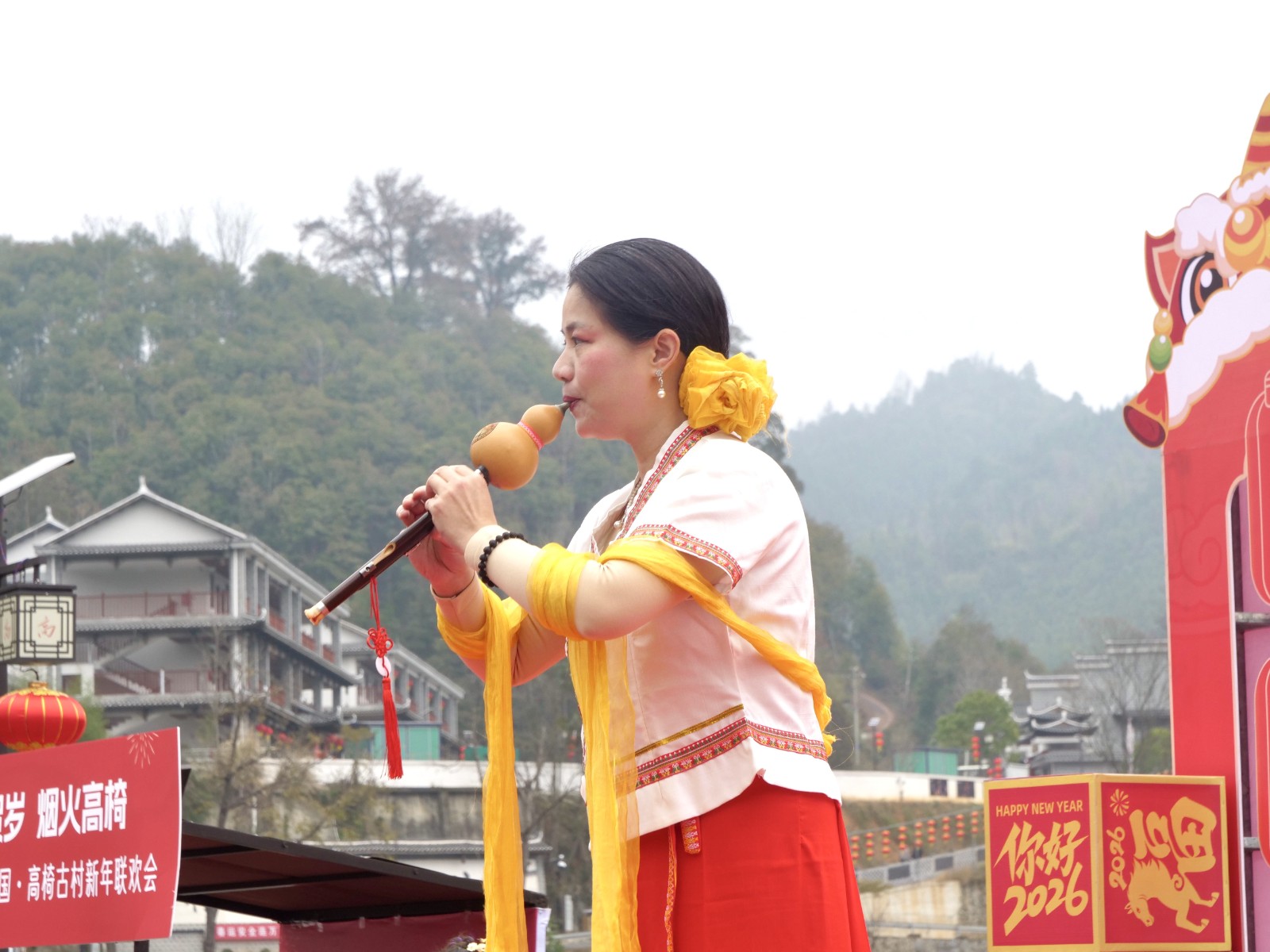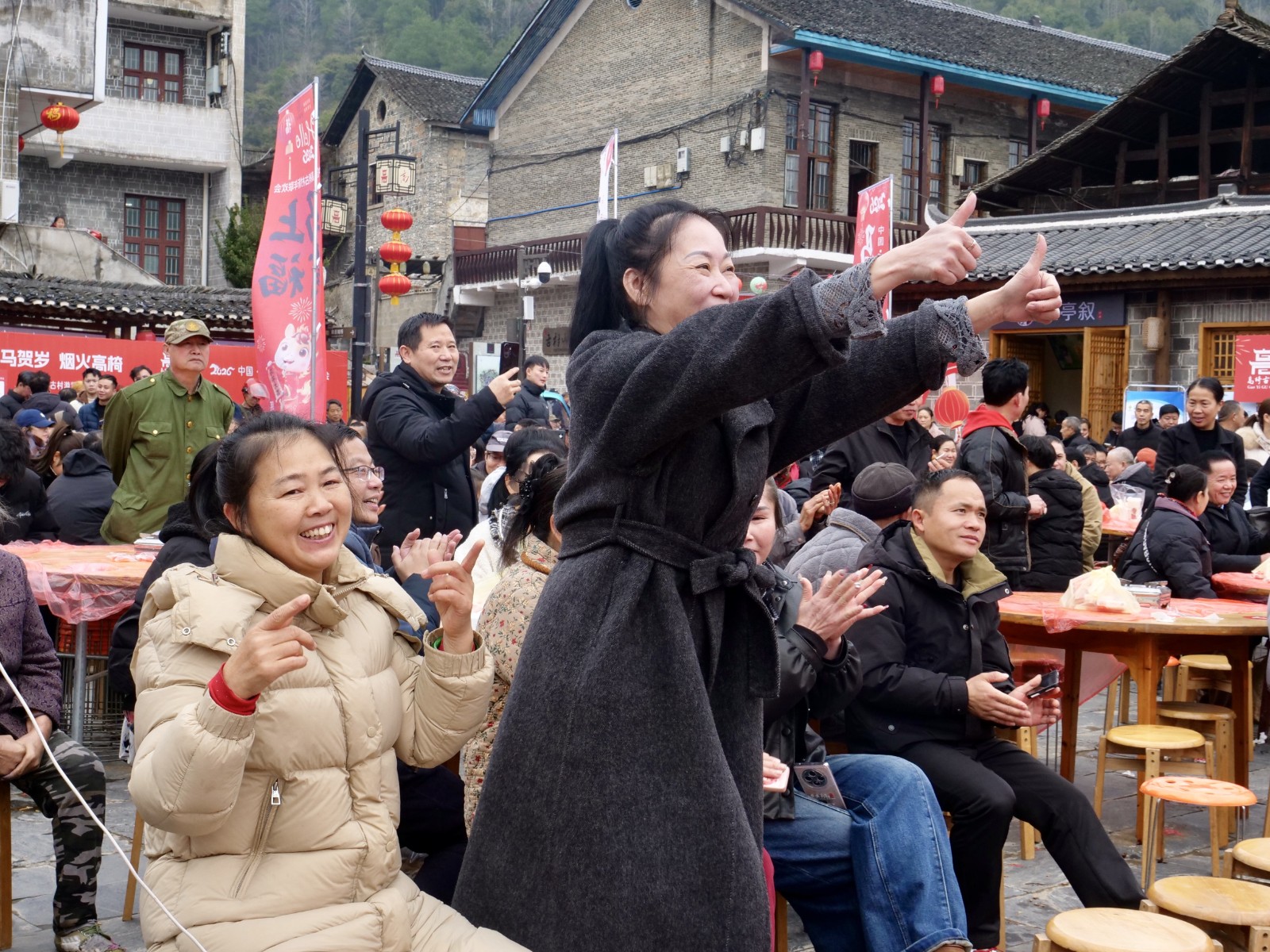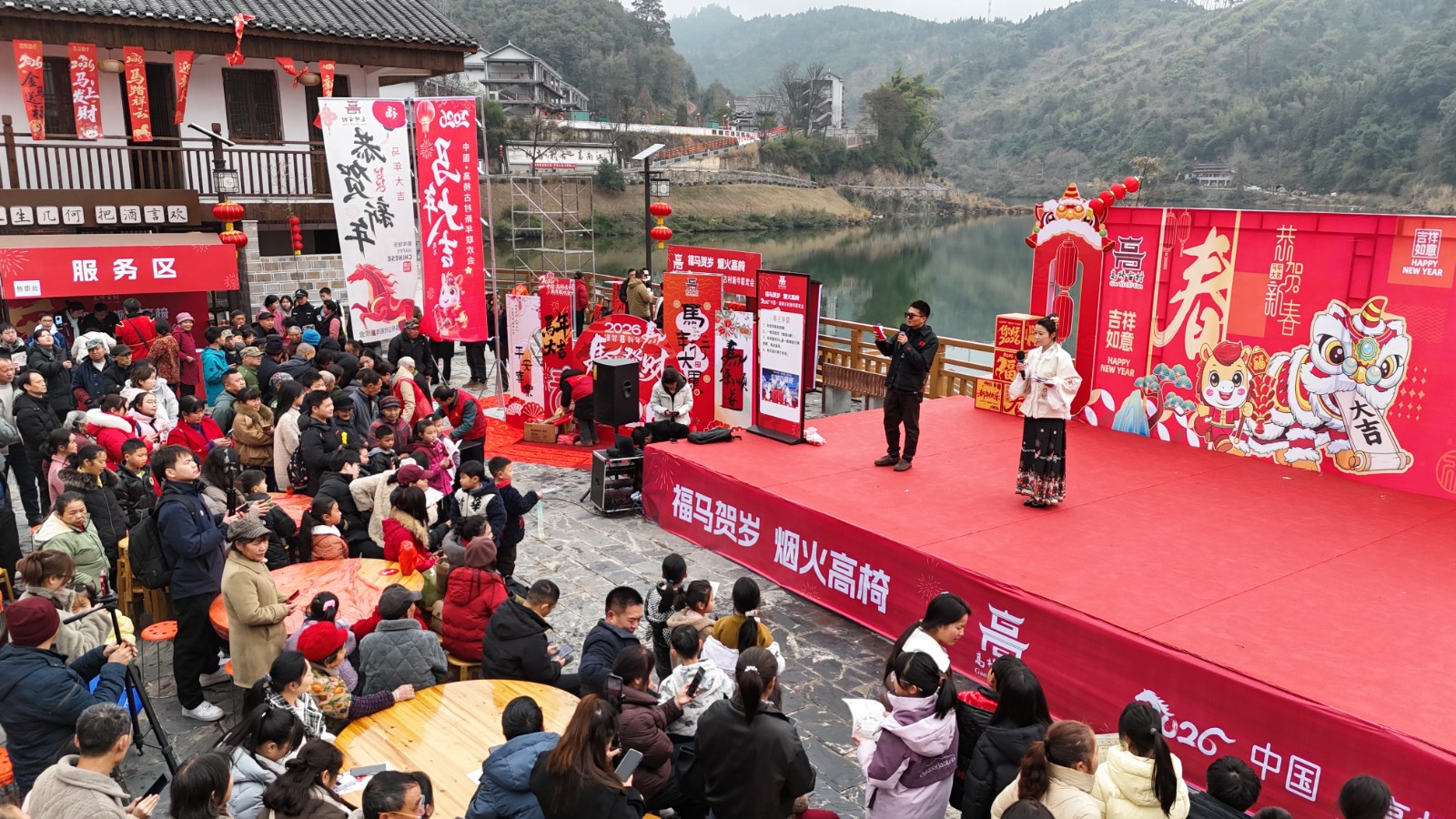 锣鼓一响,全场沸腾。非遗民俗节目登场,傩戏传承人面具各异,舞步古朴,一口喷火烈焰腾空,欢呼声、掌声瞬间掀翻广场。村歌擂台赛上,村民与游客同台开唱,侗歌悠扬、新曲欢快;民俗答题趣味满满,大家争相抢答,在互动里读懂侗乡故事。书法爱好者挥毫泼墨,福字、春联免费相送,墨香与年味缠在一起,暖到心底。