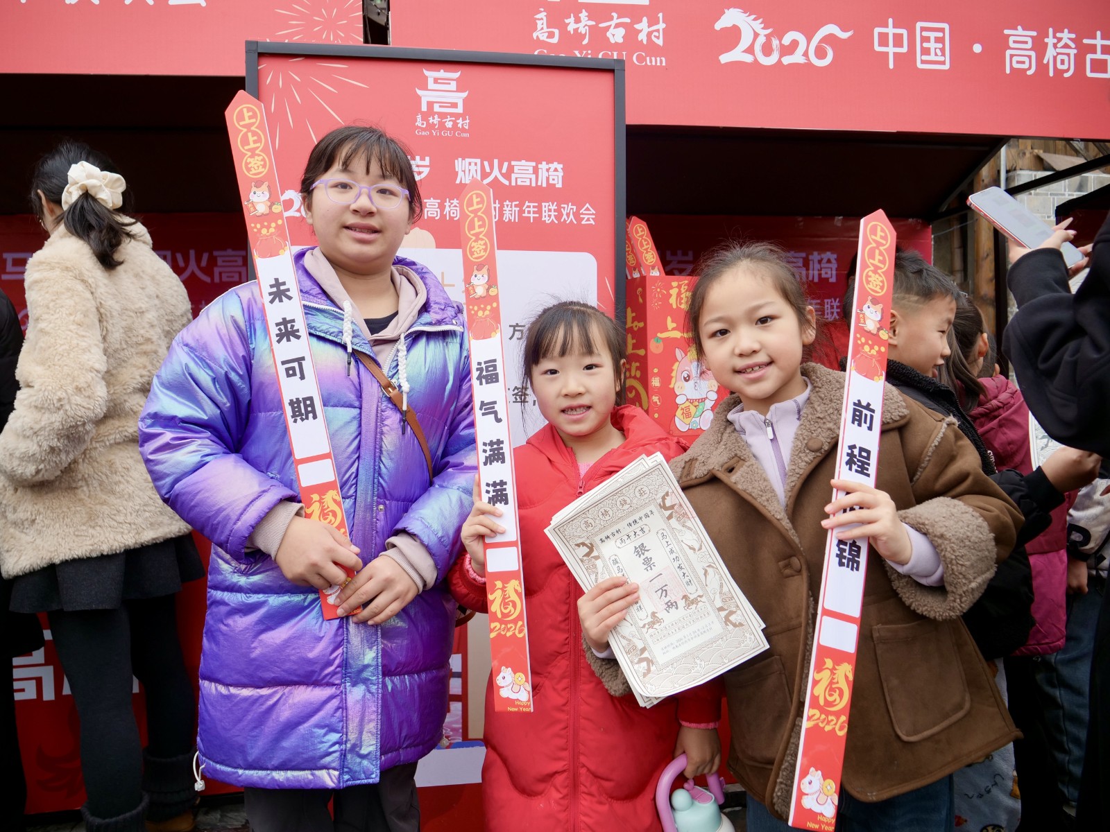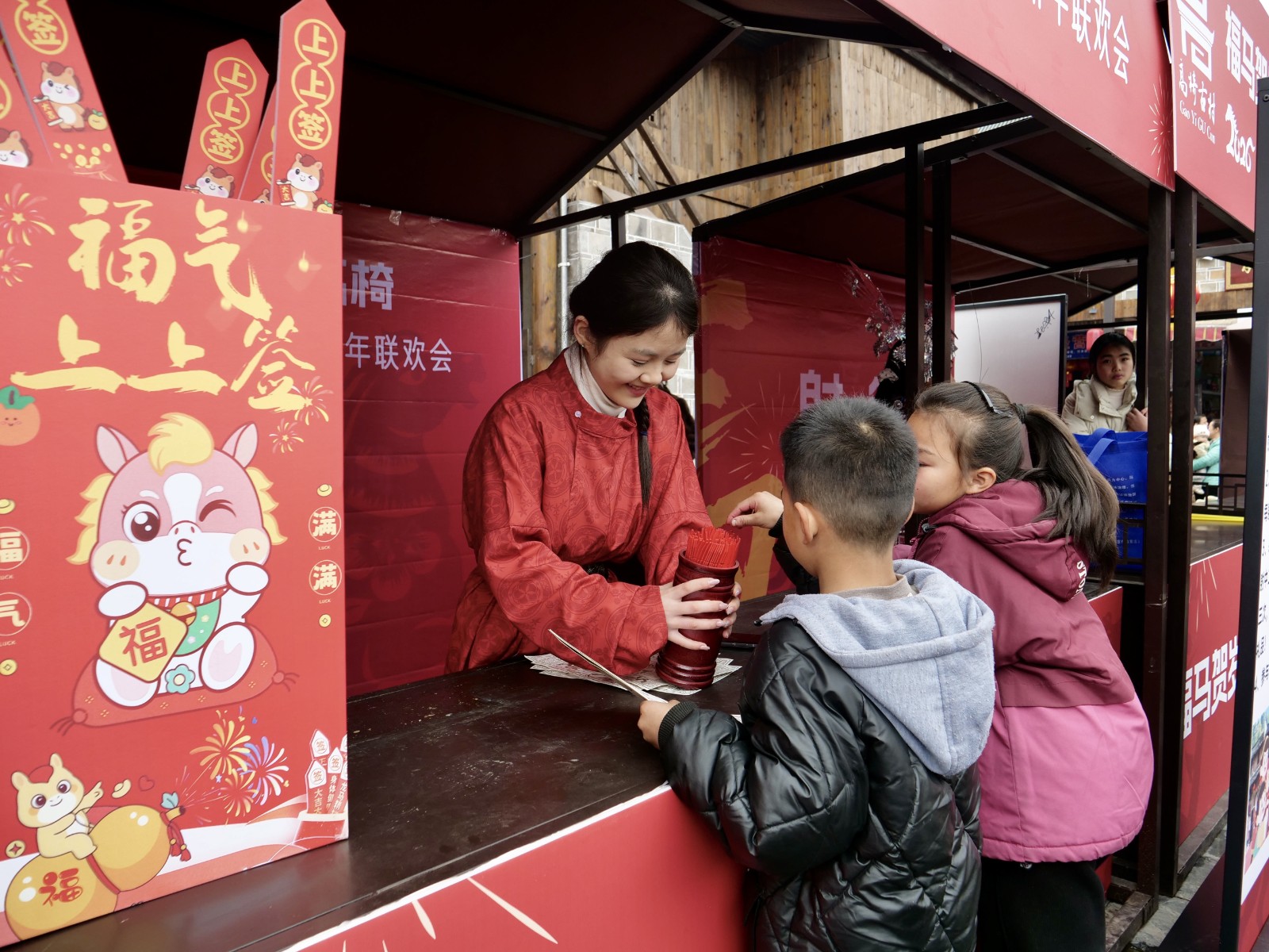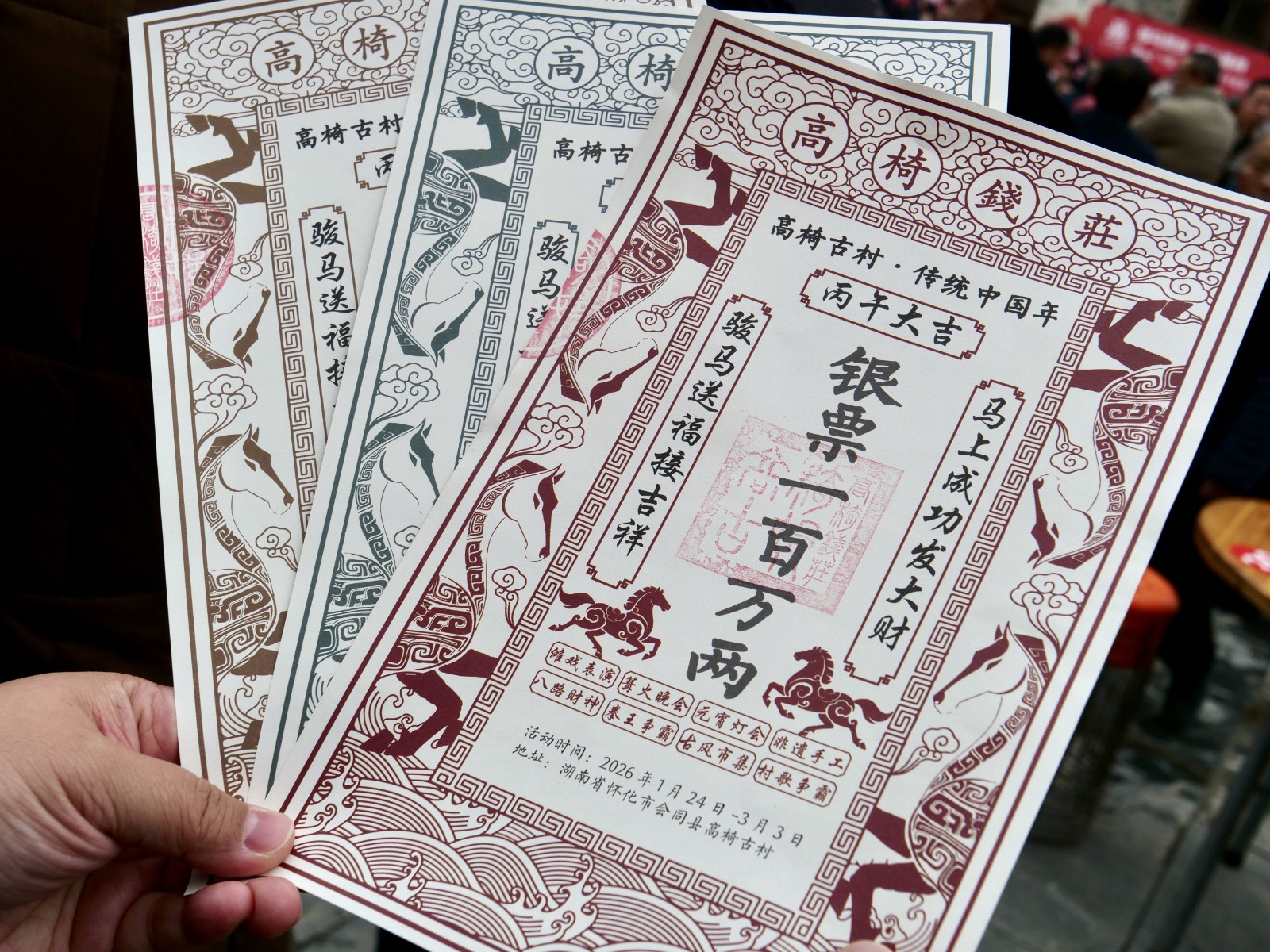 更有意思的是“高椅银票”。印着马年元素的银票,成了逛村的“快乐通关卡”:兑换可消费,游玩能赚取,凭票享折扣、换美食、兑文创,还能体验“马上暴富”的快乐。“兑了12万银票,玩游戏又赢了不少,今天我就是古村大富翁!”当地小游客唐智坤举着厚厚一沓银票,笑得满脸灿烂。