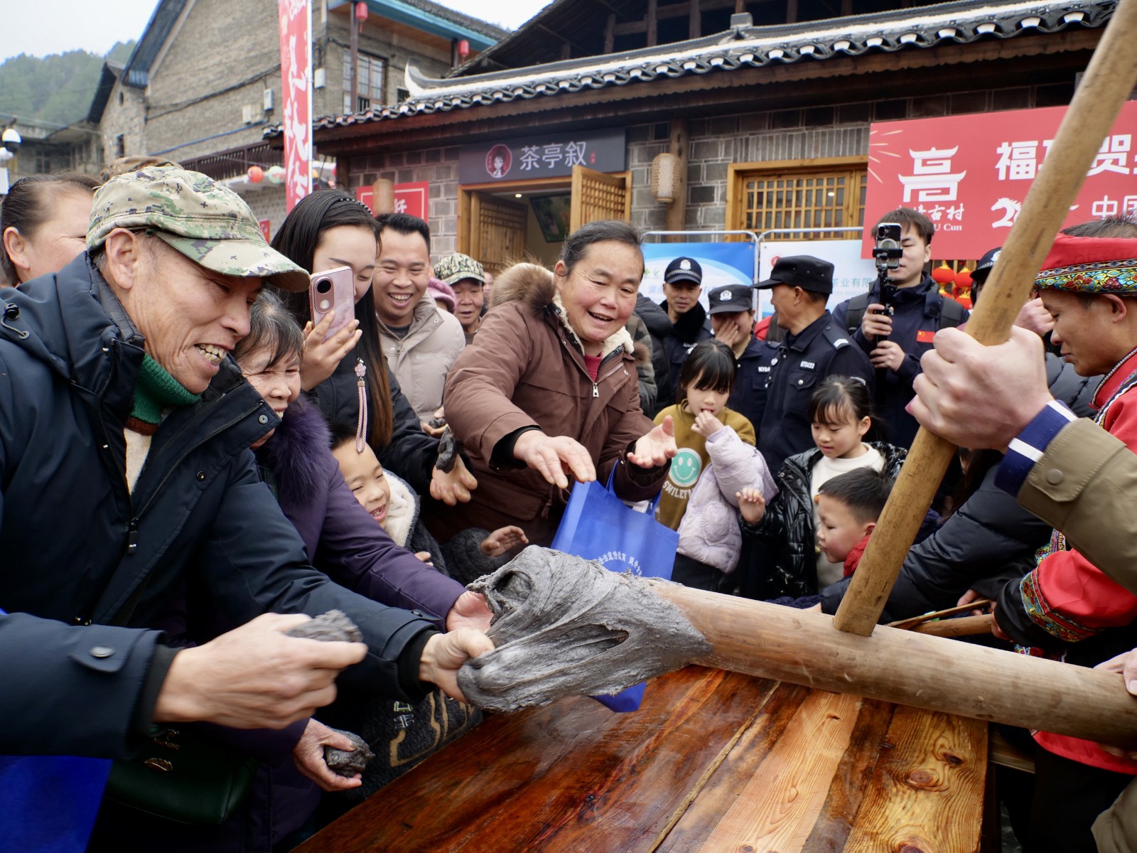 新年的仪式感,藏在最质朴的民俗里。添柴加薪祈福,游客执柴入火塘,一句“岁岁红火”,把新年期盼烧得滚烫;杀年猪、庖汤宴轮番开场,游客与村民围坐一桌,热汤暖胃,笑语暖心,这是童年里最真切的年的模样。“从浙江带娃赶来,打糍粑、看表演、吃庖汤,这才是过年该有的热闹!”浙江游客杨庆抱着孩子,满眼都是幸福。