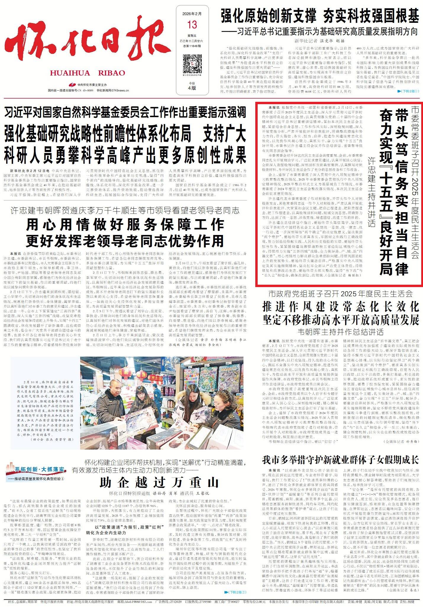 怀化日报全媒体讯根据党中央统一部署和省委要求,2月12日,市委常委班子召开2025年度民主生活会,深入学习贯彻习近平新时代中国特色社会主义思想,认真贯彻落实党的二十届四中全会精神和习近平总书记重要讲话精神,紧扣本次民主生活会主题,紧密结合自身思想、工作和作风实际,深刻检视问题,深入开展党性分析,严肃开展批评和自我批评,明确整改措施和努力方向,带头笃信、务实、担当、自律,推进作风建设常态化长效化,以优良作风凝心聚力、真抓实干,奋力实现“十五五”良好开局。市委书记许忠建主持会议并作总结讲话。省委督导组有关同志到会指导。