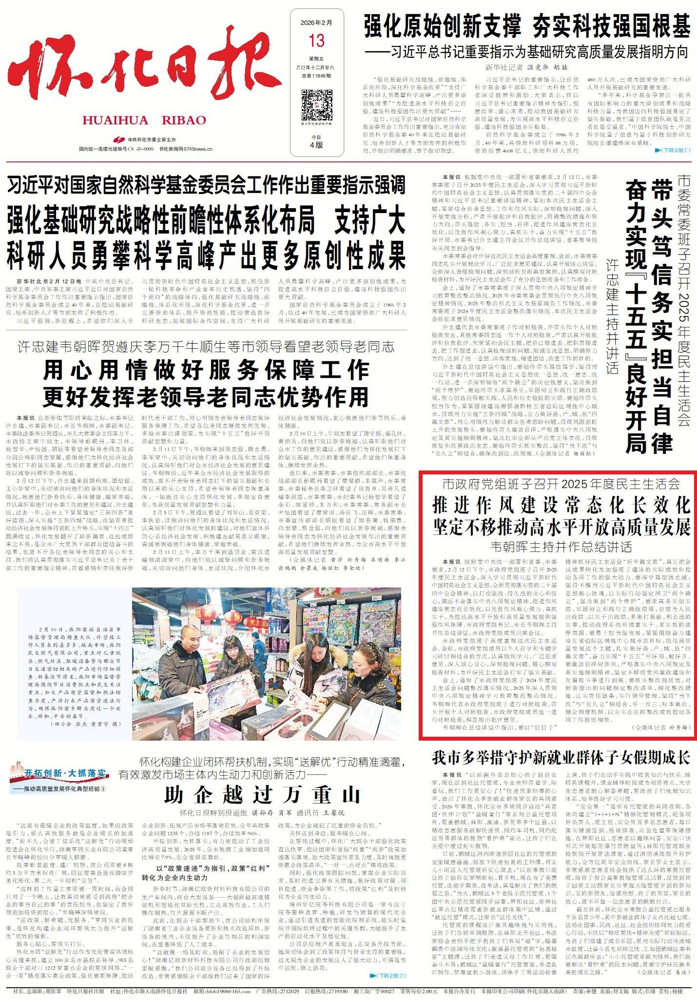 怀化日报全媒体讯按照党中央统一部署和省委、市委要求,2月12日下午,市政府党组班子召开2025年度民主生活会,深入学习贯彻习近平新时代中国特色社会主义思想,全面贯彻落实党的二十届四中全会精神,以打攻坚战、持久战的决心和恒心,锲而不舍落实中央八项规定精神,推进作风建设常态化长效化,以优良作风凝心聚力、真抓实干,为推动高水平开放和高质量发展提供坚强作风保障。市政府党组书记、市长韦朝晖主持并作总结讲话,市政府党组成员出席会议。