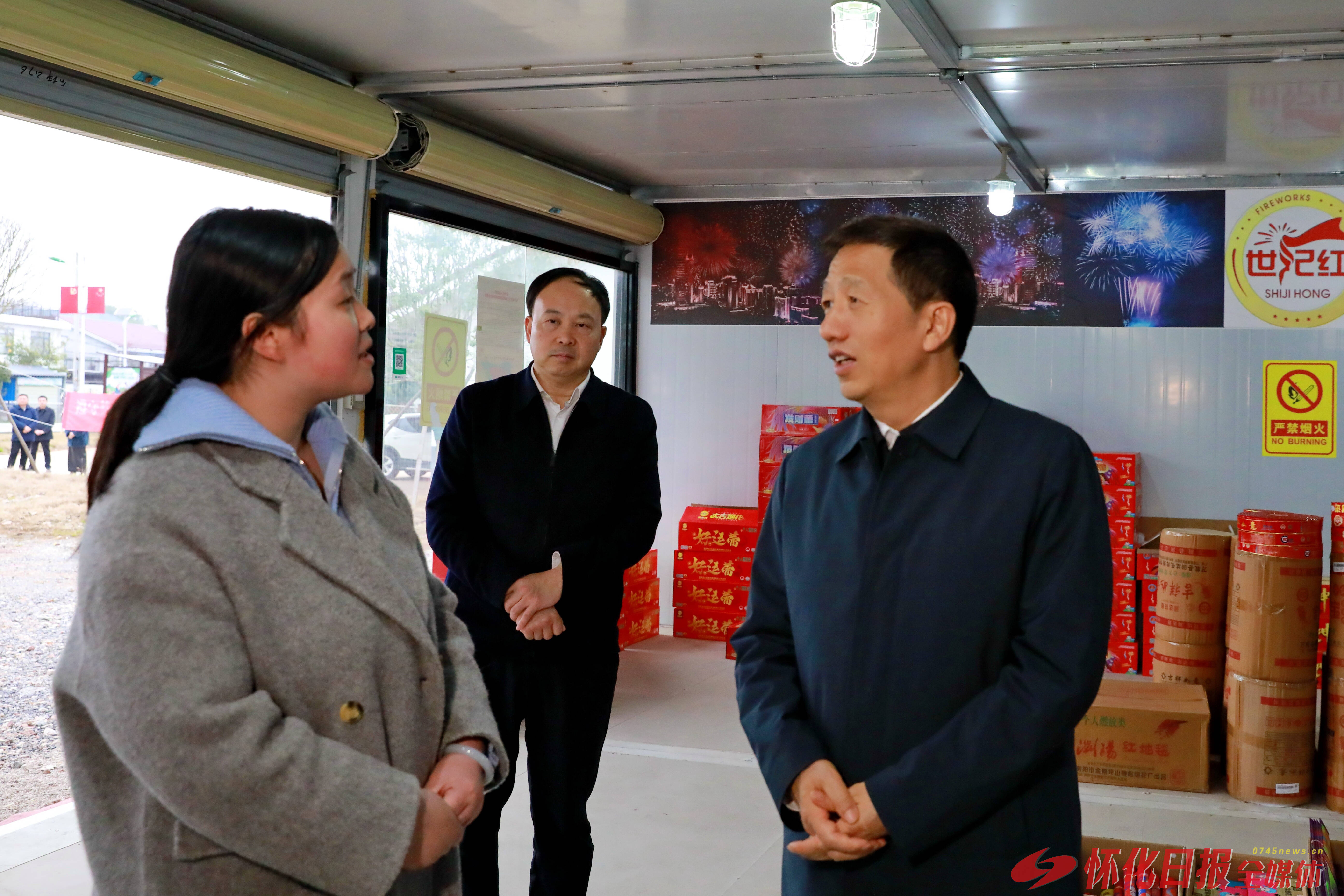 (2月25日下午,市委书记许忠建在城区检查督导安全生产工作。图为许忠建在炫通烟花鞭炮店与门店老板深入交流,详细了解烟花爆竹储存规范、消防设施配备及日常安全管理情况。怀化日报全媒体记者 彭军 摄)