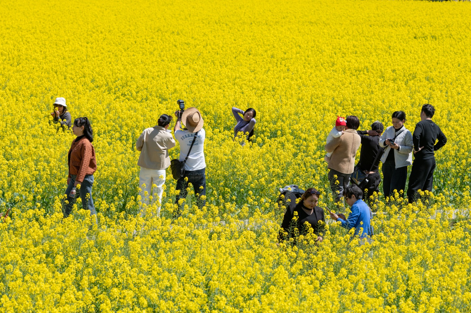 漫步堡子镇万亩油菜花海,金黄花田与蓝天白云、诗意装置相映成画。“花花世界”打卡点包括花海热气球、花海风筝秀和巨型稻草景观,以花海为幕、创意造型为景,搭配诗歌长廊、七彩风车与田园艺术装置,一步一景、处处出片。游客们沿着观景栈道穿行其间,或举手机自拍、或架相机拍摄,亲子家庭、汉服爱好者、摄影达人齐聚点位,摆造型、留合影,欢声笑语洒满花田,一张张春日大片实时刷屏朋友圈。