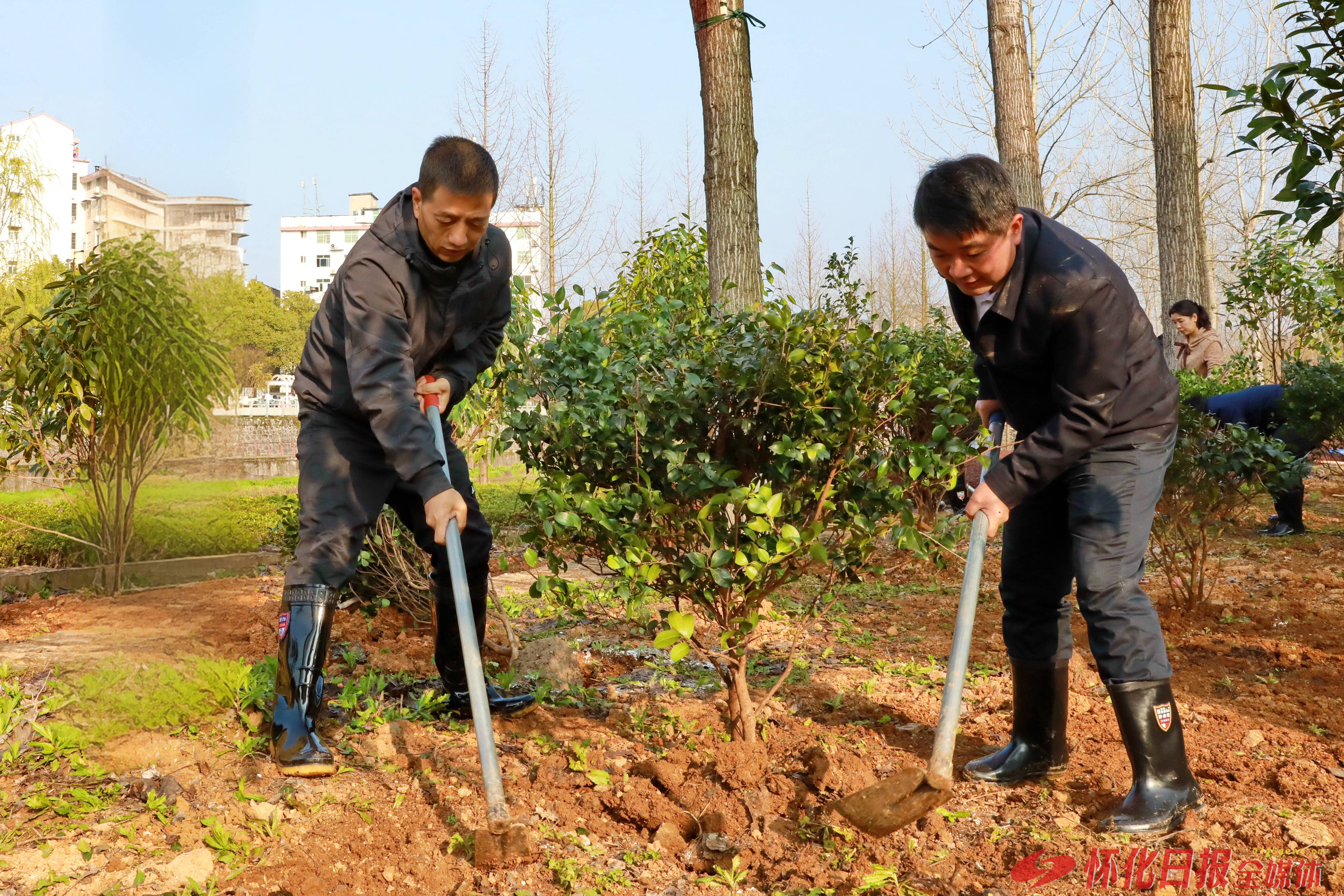 植树现场,许忠建、贺遵庆、李万千等市领导与青年志愿者、机关干部一起,合力栽植大花红山茶、桂花、梅花、紫薇、水杉、茶梅、鸡爪槭等苗木。