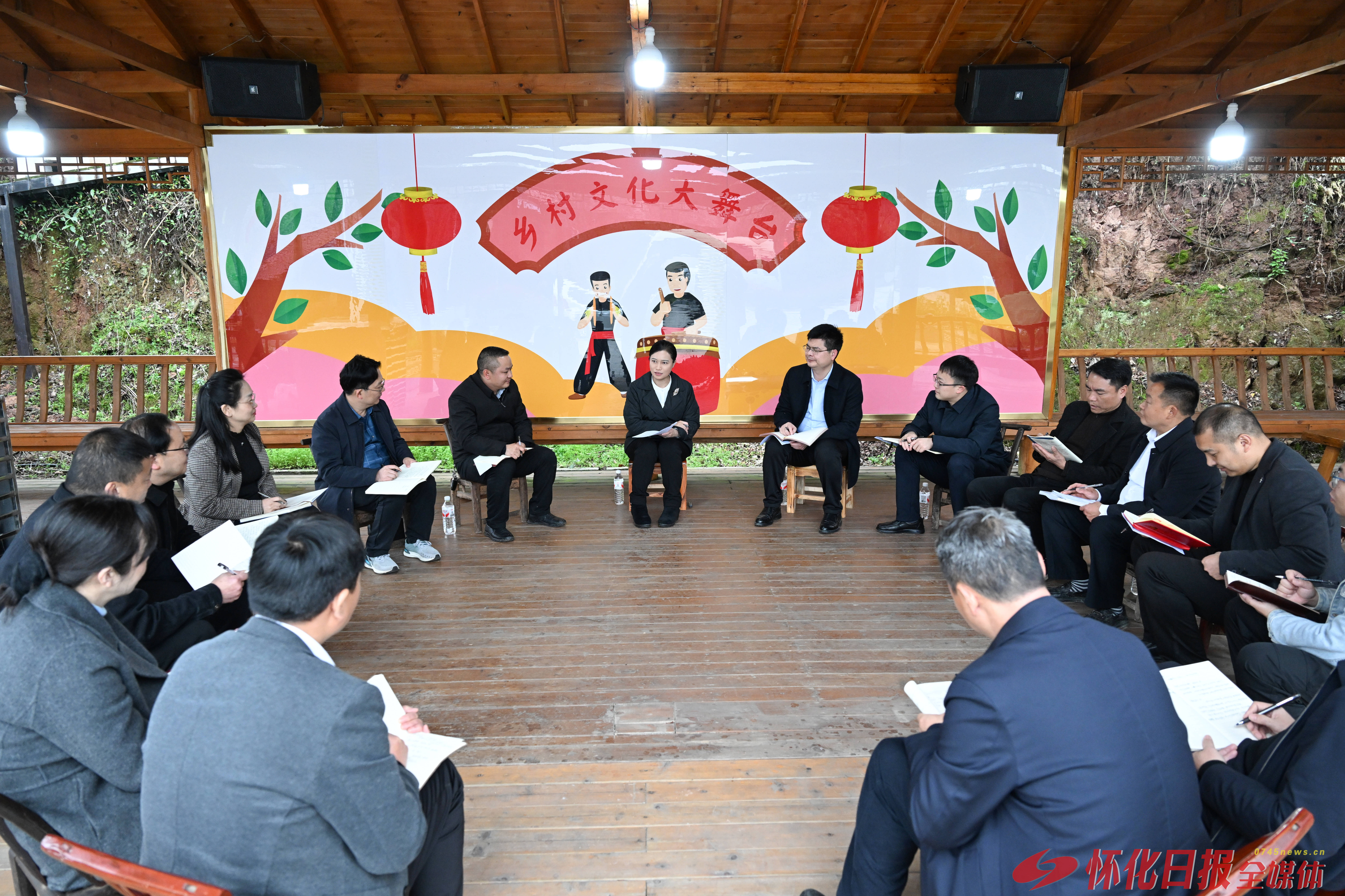 来到鹤城区凉亭坳乡杨潭村杨柳溪院子,韦朝晖实地察看农村人居环境整治成效,详细了解村庄规划、农文旅融合、产业带动、团寨风貌保护等情况。随后,以座谈交流方式向市区政协委员、基层干部代表宣讲全国两会精神。