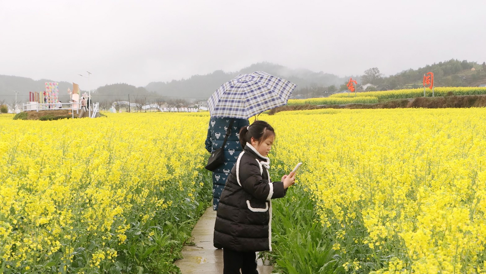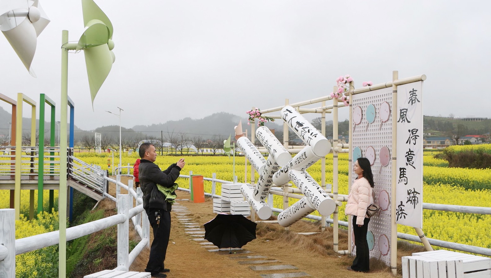 当日,景区万亩油菜花次第绽放,与诗歌长廊、观光小火车相映成趣,构成“金色花海+诗意田园”的绝美画卷。花田间,“花花世界”主题打卡点已提前开放,摄影爱好者架起相机定格春光,亲子家庭在田埂间追逐嬉戏。