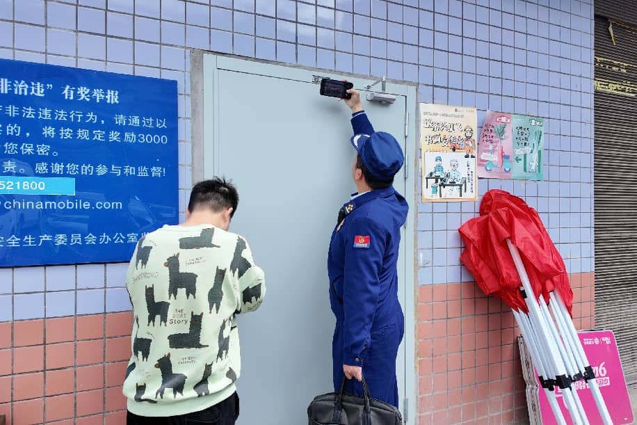 大队监督检查人员直击风险核心区,对移动公司营业厅、办公区、核心机房等“要害部位”展开全面“体检”。检查人员俯身测试应急照明灯、逐层摸排电气线路、细查疏散通道,不放过任何蛛丝马迹。检查发现,该企业楼梯间堆放大量纸箱与废弃物料,犹如堵塞“生命通道”的“拦路虎”。“一旦发生火情,这些杂物将成为人员逃生的致命障碍!”检查人员当场开具整改清单,责令负责人立即清理,并现场示范如何规范巡查,杜绝隐患“回潮”。
