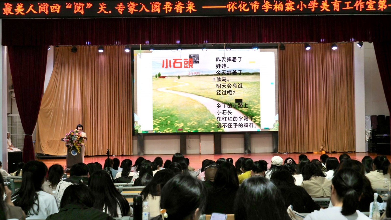 活动现场,专题讲座、文学互动、实践教学研讨等系列活动有序开展。特邀嘉宾湖南诗歌学会副会长张战带来《儿童诗:为何读?怎样选?怎样读?》主题讲座,围绕儿童诗教学的核心意义、篇目甄选、教学方法等内容展开细致讲解,为教师们开展儿童诗教学提供了专业的理论支撑与实践思路。随后的作家进校园互动环节,进一步拉近了学生与文学、诗歌的距离,营造了乐学善读的浓厚氛围。