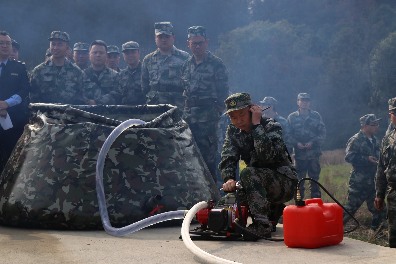 随着裁判员下达开始口令,参赛队员携带森林消防水泵、枪头、水带等专业灭火救援设备快速到达指定位置,完成水带铺设、机具设备连接等动作。