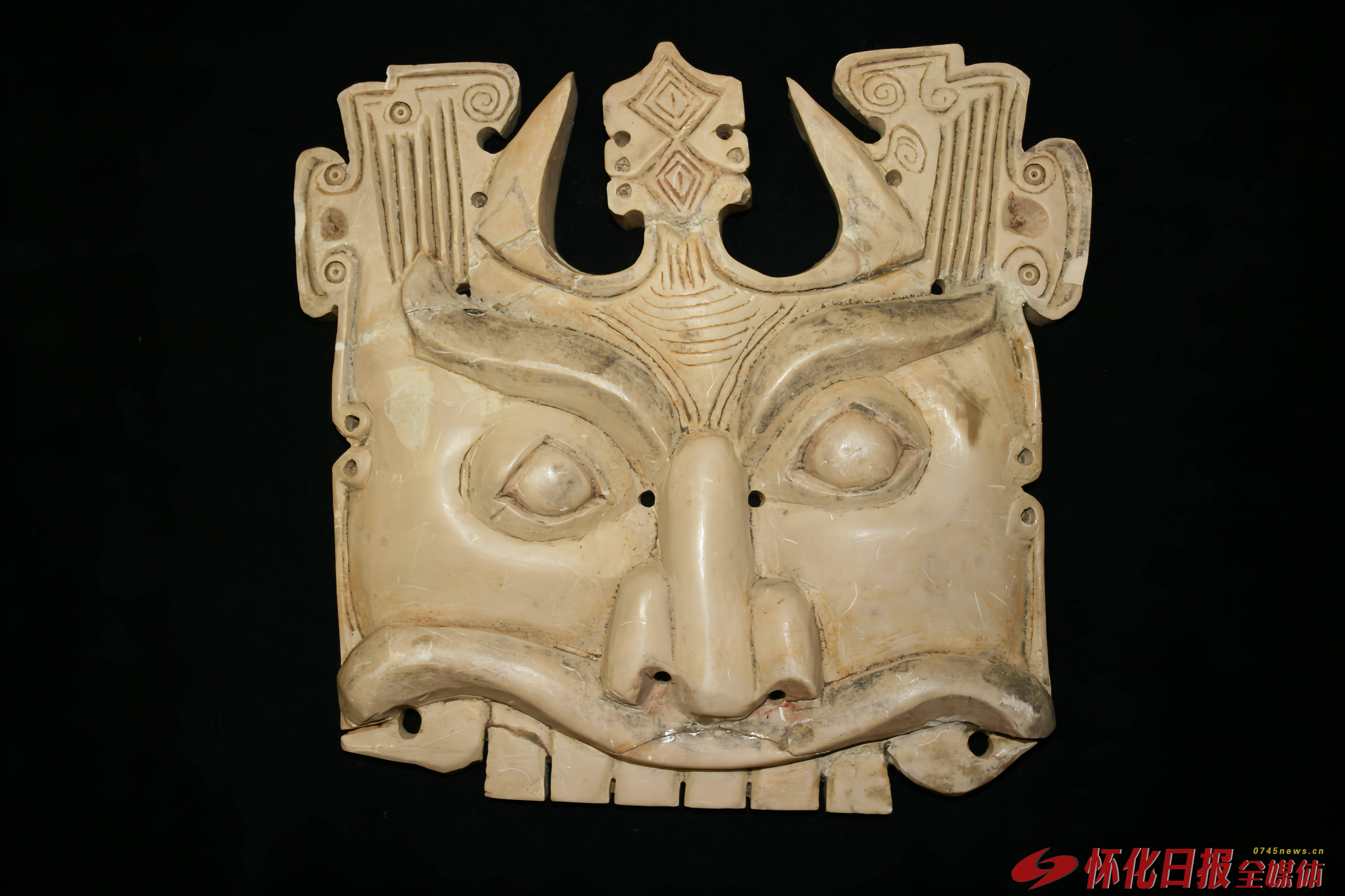 这件一级文物馆藏于怀化市博物馆,有着高耸的冠顶、双角、人面形象,卷曲的眉毛、鼓起的眼睛、宽阔的鼻子、宽阔的嘴巴和显露的牙齿。