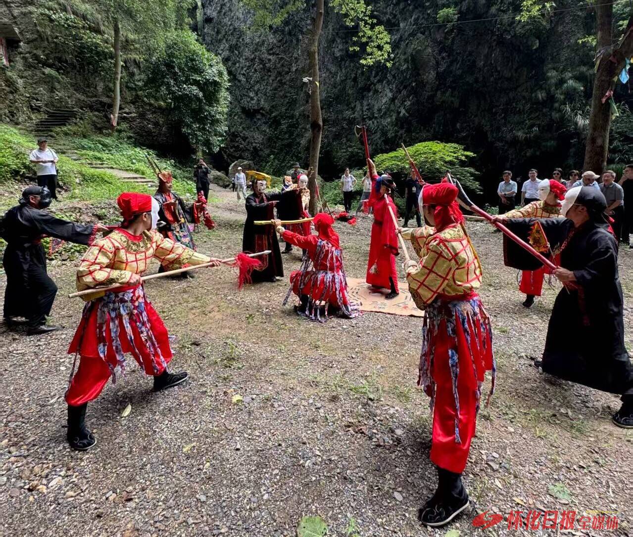 洞前,一出傩舞表演正在进行。十余名戴着彩色面具的舞者,在身着华服、头戴锦冠的傩师引领下翩然起舞。他们双臂舒展如翼,双腿屈伸有度,每一个动作都透着远古巫祭的神韵。随着仪式推进,舞者们手持各式兵器,在傩师的号令下往来穿梭,或进或退,仿佛正在与无形的邪祟展开一场激烈的搏斗。