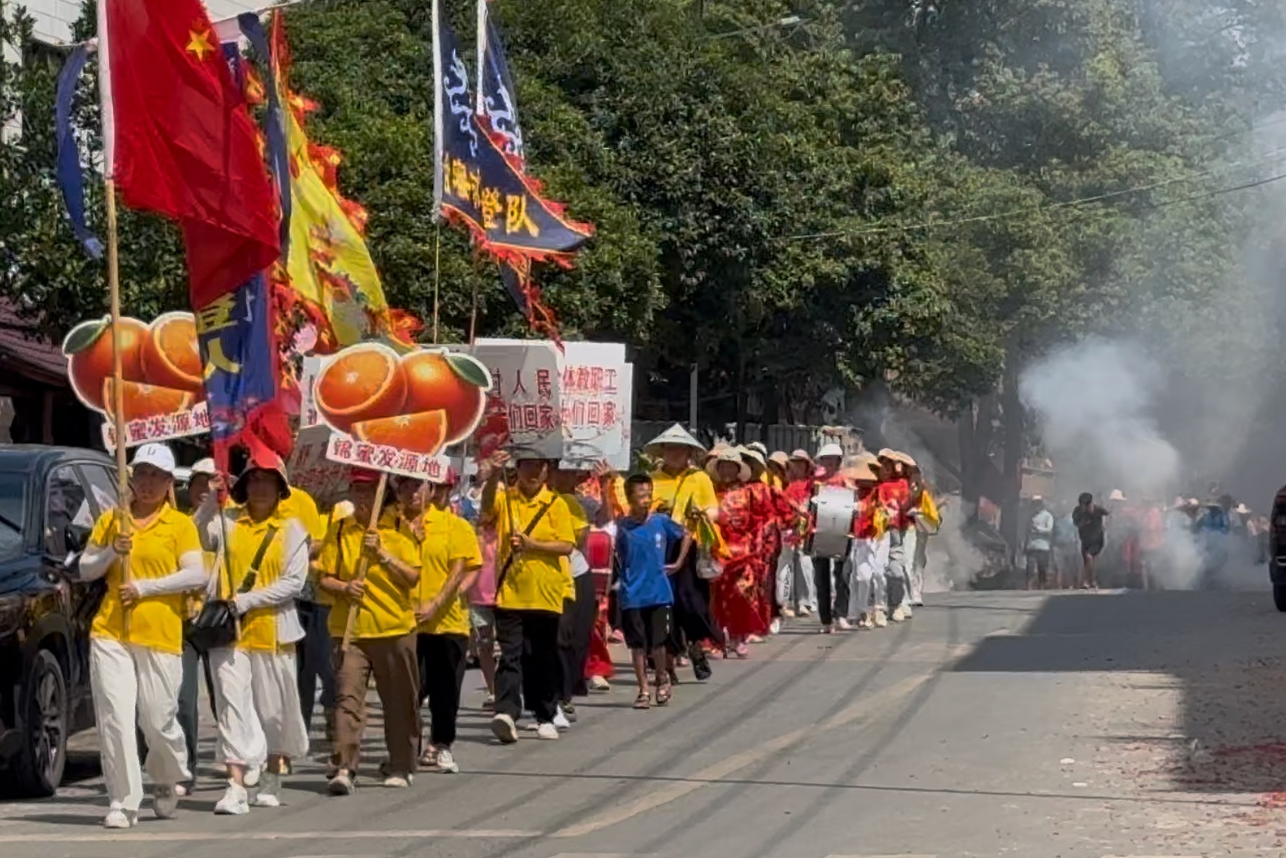 除了4个方阵外,还有几十名负责后勤的村民开车带着各种物资提前出发,分散到沿途乡镇村庄做准备。“全部加起来有400多人,最小的6岁,最大的92岁。”陈启刚说。