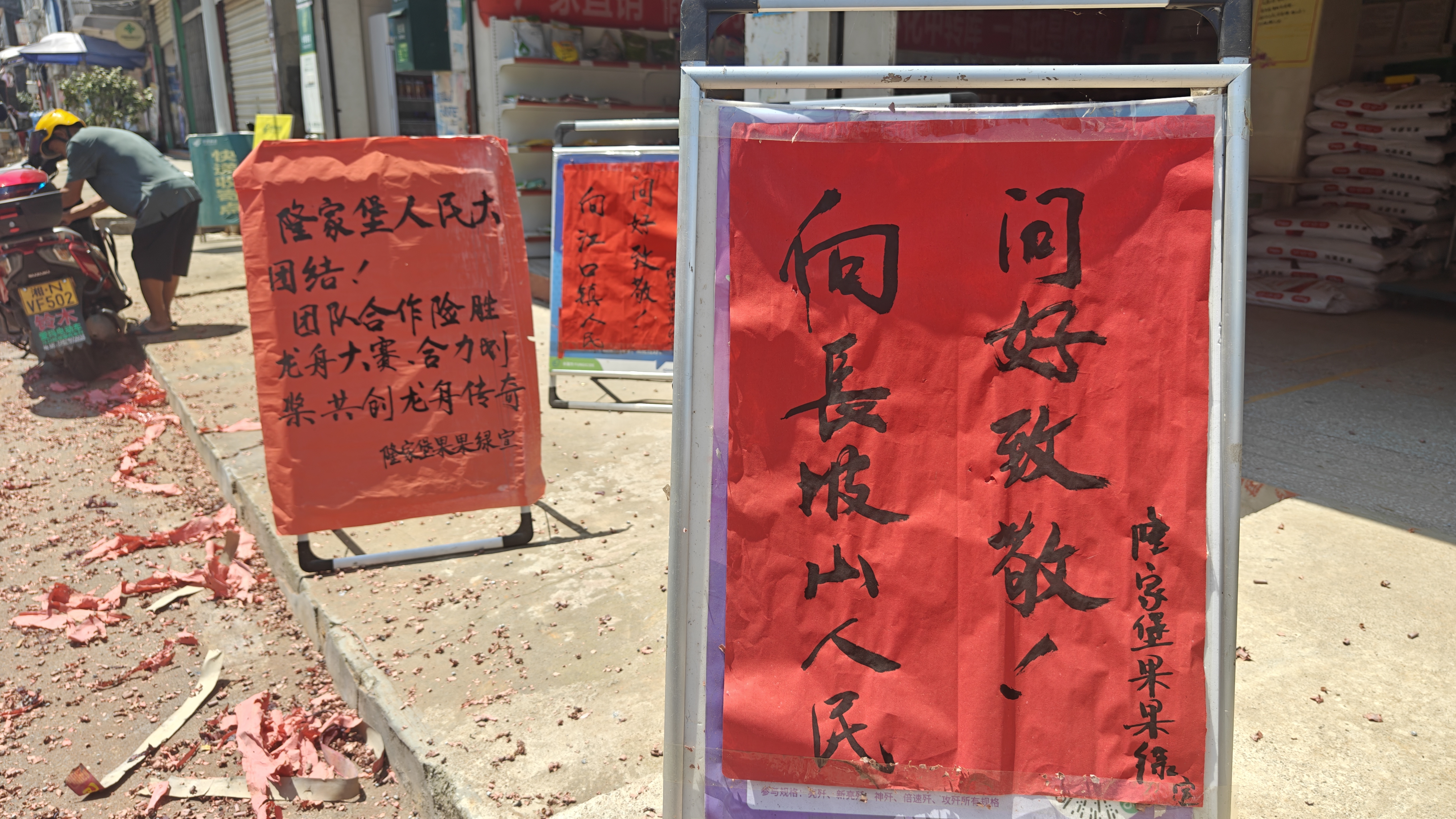 10多分钟后,同样参加完比赛返乡、名次比长坡山村高不少的隆家堡乡龙舟队从县城方向走来。长坡山村的队伍立刻抖擞精神开始敲锣打鼓,大声喊道:“恭喜隆家堡!隆家堡舒家村友谊万岁!”对方也一边敲锣打鼓,一边大声回应:“舒家村加油,舒家村隆家堡两家亲!”