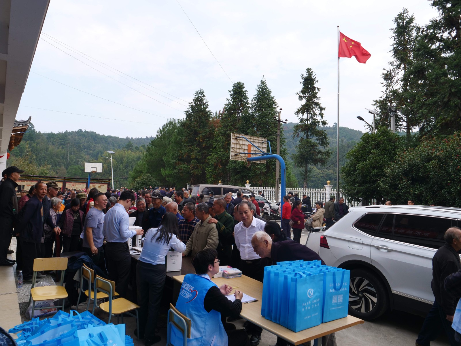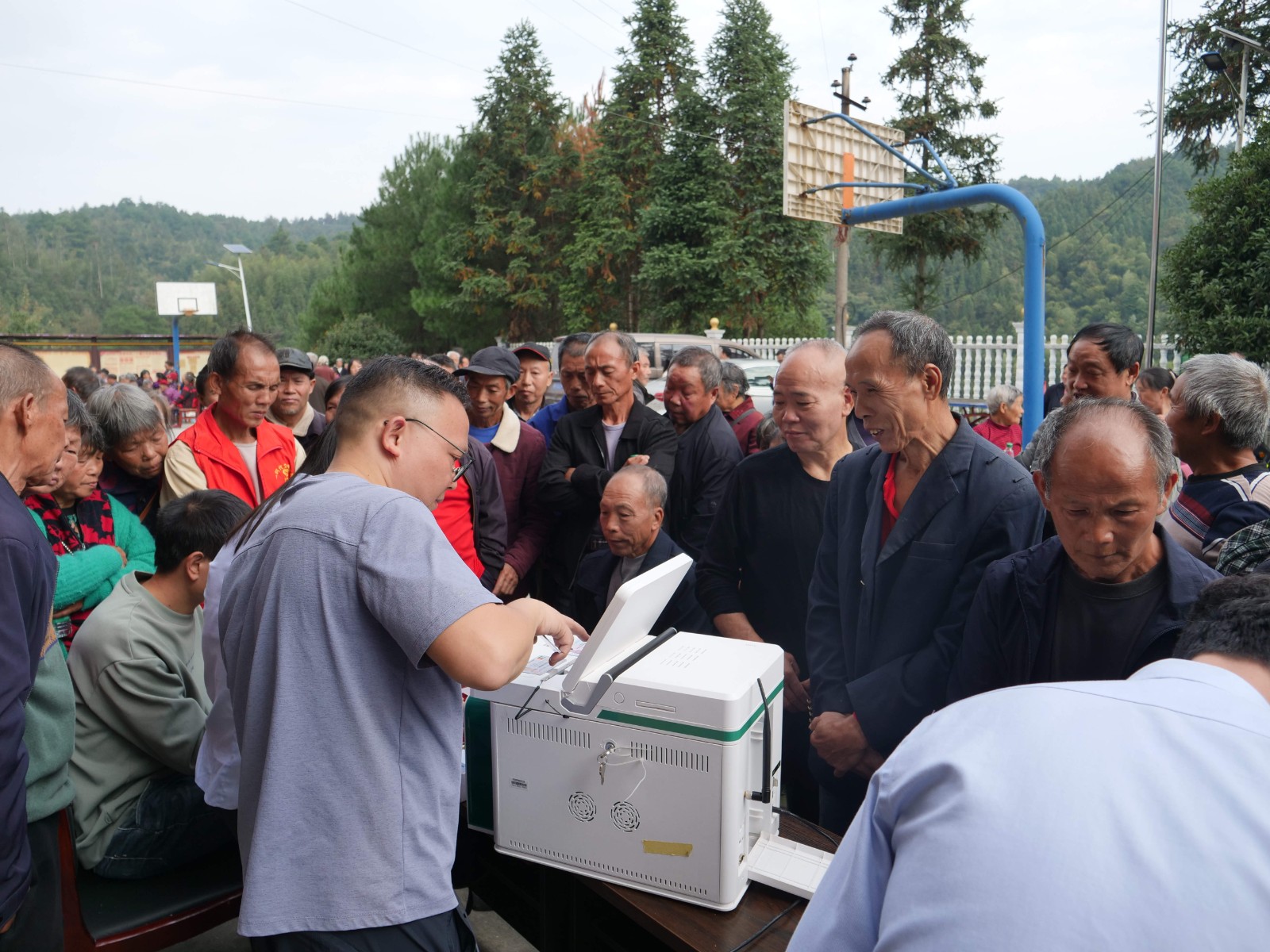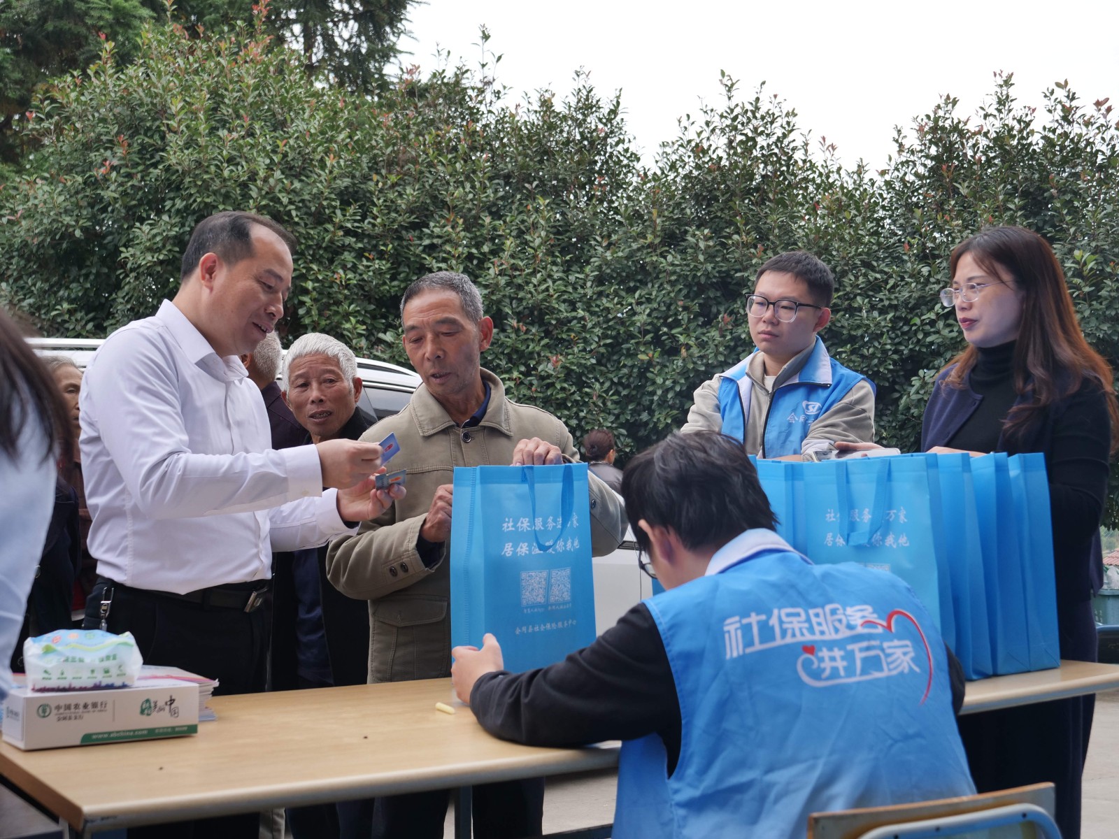 在马田村文化广场的服务现场,临时服务台前排起长队。农业银行工作人员携即时制卡设备坐镇服务台,针对老年群体行动不便、操作不熟练等问题,提供“一对一”全流程指导,实现电子社保卡即时领、当场办。