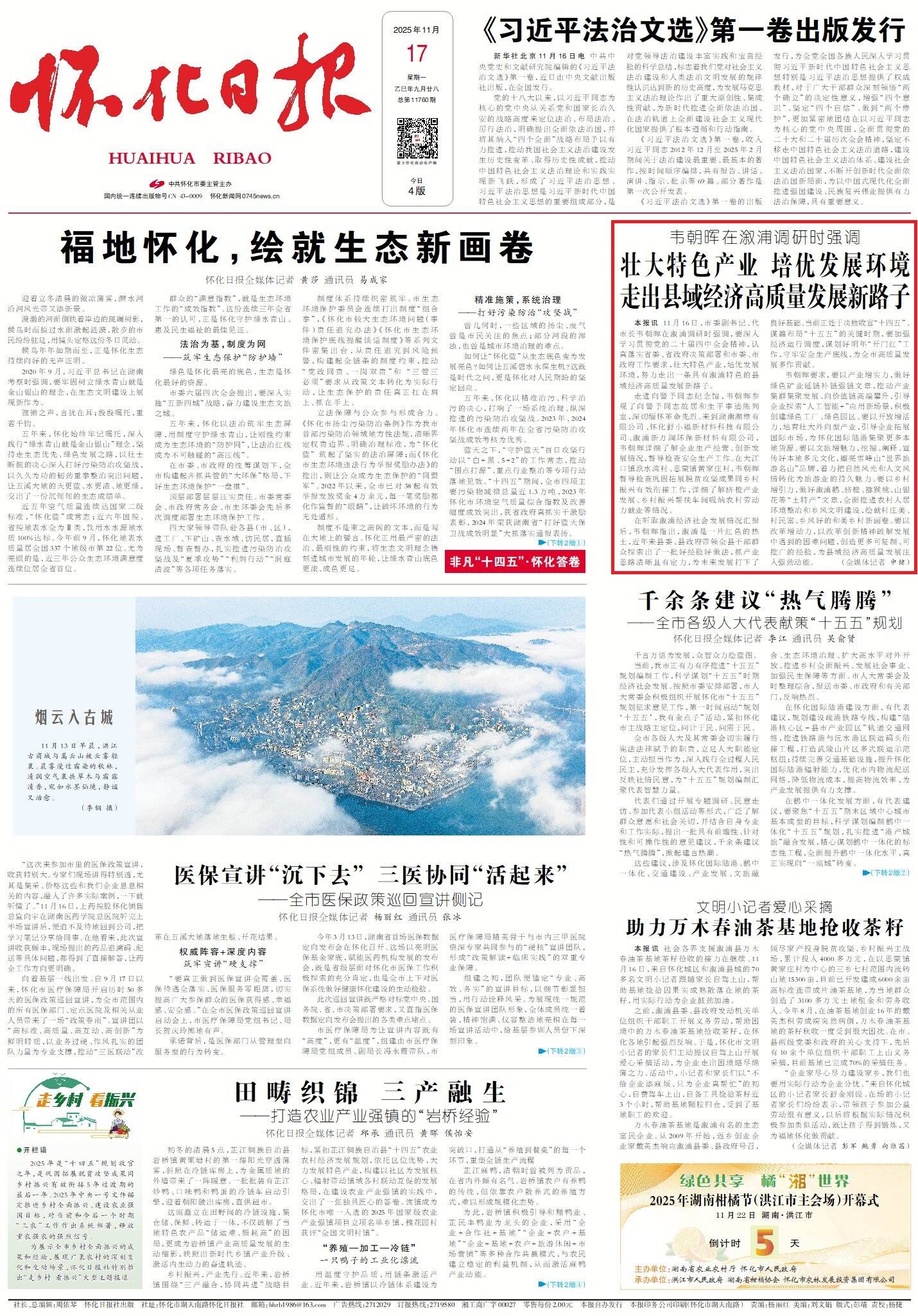 韦朝晖要求,要以产业增实力,做好绿色矿业延链补链强链文章,推动产业集群集聚发展、向价值链高端攀升,引导企业探索“人工智能+”应用新场景,积极创建绿色工厂、绿色园区。要以开放增活力,培育壮大外向型产业,引导企业拓展国际市场,为怀化国际陆港集聚更多本地货源。要以文旅增魅力,挖掘、阐释、宣传好本地多元文化,擦亮雪峰山“世界旅游名山”品牌,着力把自然风光和人文风情转化为旅游业的持久魅力。要以乡村增引力,做好溆浦鹅、脐橙、猕猴桃、山银花等“土特产”文章,全面推进农村人居环境整治和乡风文明建设,绘就村庄美、村民富、乡风好的和美乡村新画卷。要以改革增动力,以改革创新精神破解发展中遇到的困难问题,创造更多可复制、可推广的经验,为县域经济高质量发展注入强劲动能。