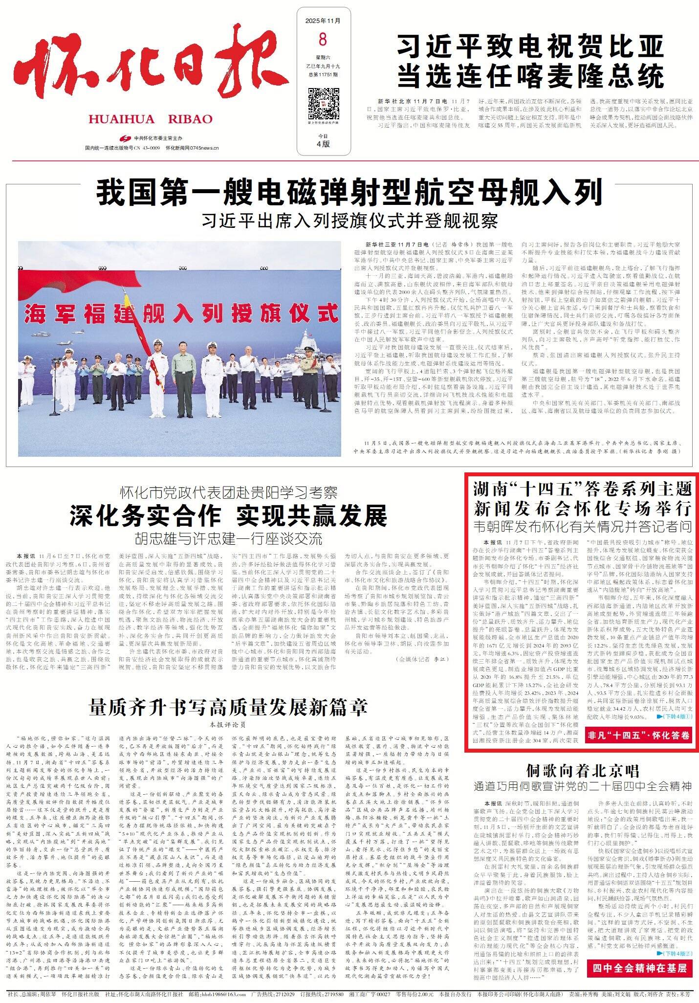 韦朝晖介绍,“十四五”时期,怀化深入学习贯彻习近平总书记考察湖南重要讲话和指示批示精神,锚定“三高四新”美好蓝图,深入实施“五新四城”战略,扎实做好“港产城旅”四篇文章,交出了一份“总量跃升、质效齐升、活力攀升、地位提升”的亮眼答卷。总量跃升,体现为发展能级跨越。全市地区生产总值由2020年的1671亿元增长到2024年的2093亿元,年均增速6.3%,固定资产投资增速连续三年排全省第一。质效齐升,体现为发展成色更足。制造业增加值占GDP比重从2020年的16.8%提升至21.5%,单位GDP能耗累计下降15.27%,全社会研发经费投入年均增长23.42%,2023年、2024年高质量发展综合绩效评价指数提升幅度全省第一。活力攀升,体现为发展动能增强。生态产品价值实现、集体林地“三权”分置等改革在全国创下“怀化模式”,经营主体数量净增超14万户,湘商回湘投资新注册企业304家,两次荣获“中国最具投资吸引力城市”称号。地位提升,体现为发展地位蝶变。怀化荣获全国性综合交通枢纽、国家粮食物流关键节点城市、国家骨干冷链物流基地等“国字号”品牌,怀化国际陆港纳入国家支持中部地区崛起政策体系,标志着怀化加速从“内陆腹地”转向“开放高地”。