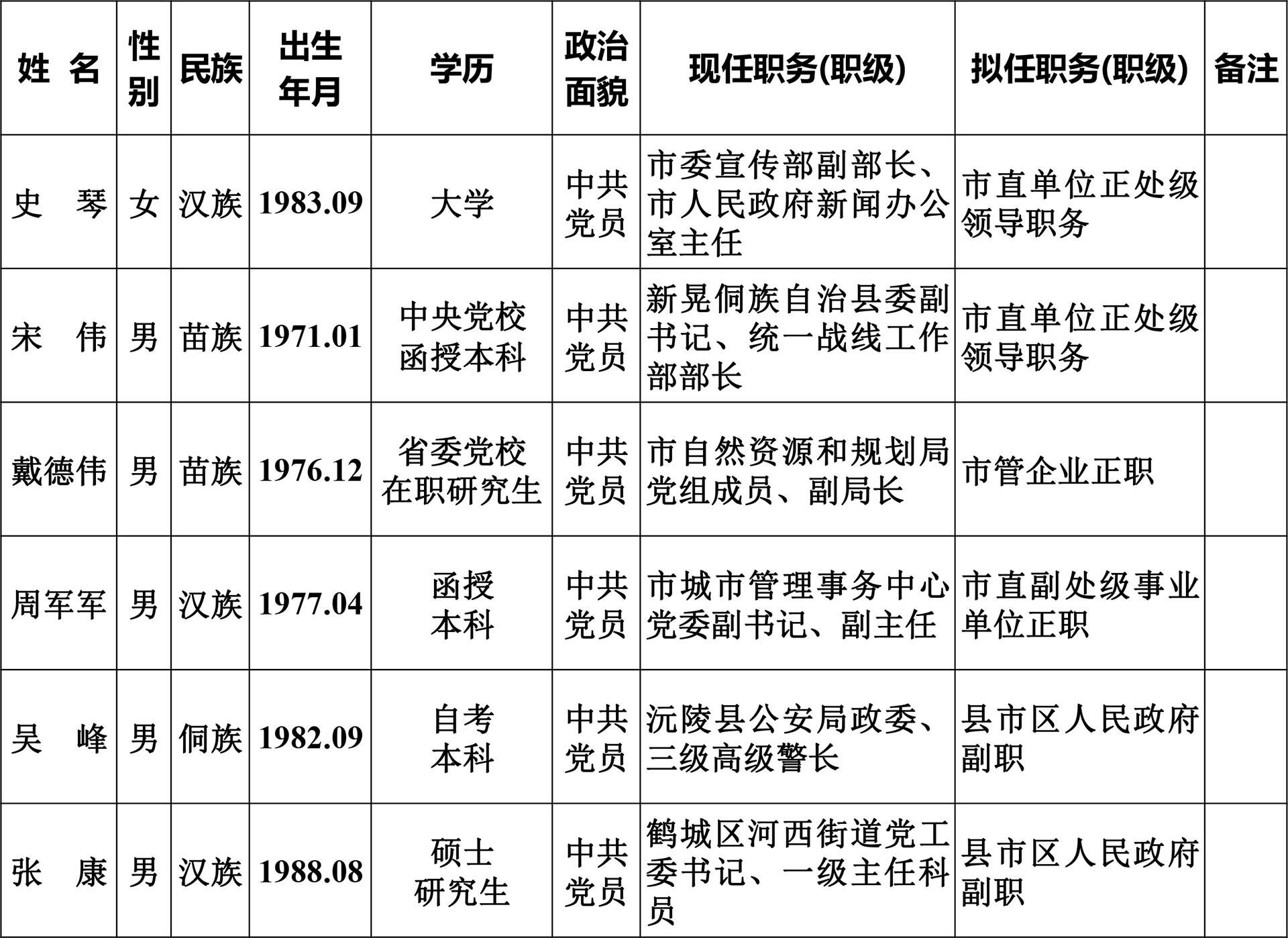 为了加强对干部选拔工作的监督,提高识别和任用干部的准确程度,现对怀化市委常委会会议研究决定的下列拟任人选(提名人选)进行任前公示。