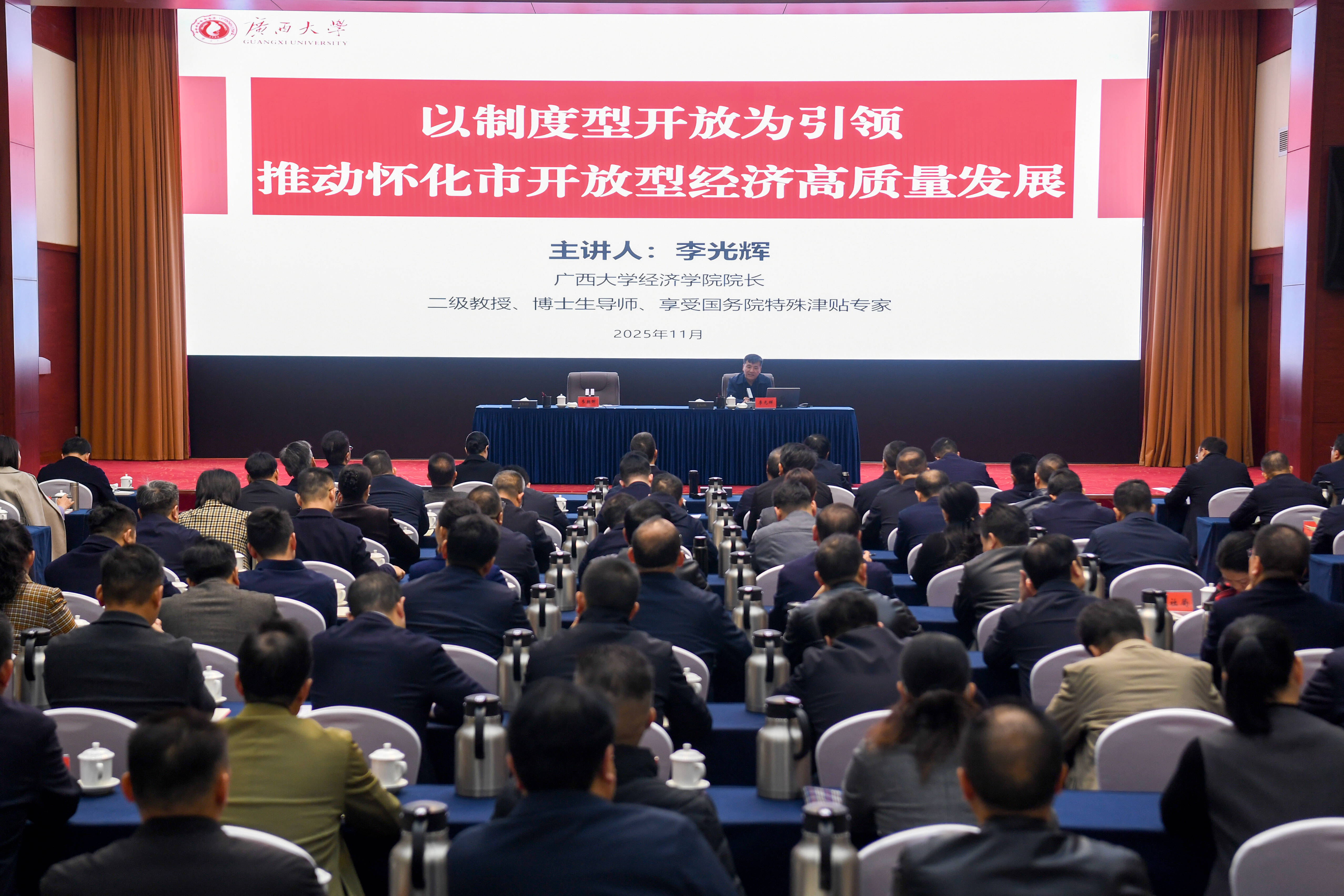 怀化日报全媒体讯11月21日上午,2025年第6期“五溪大讲堂”举行,广西大学经济学院院长李光辉作专题讲座。市委书记许忠建,市委副书记、代市长韦朝晖,市人大常委会主任李万千,市政协主席牛顺生参加。