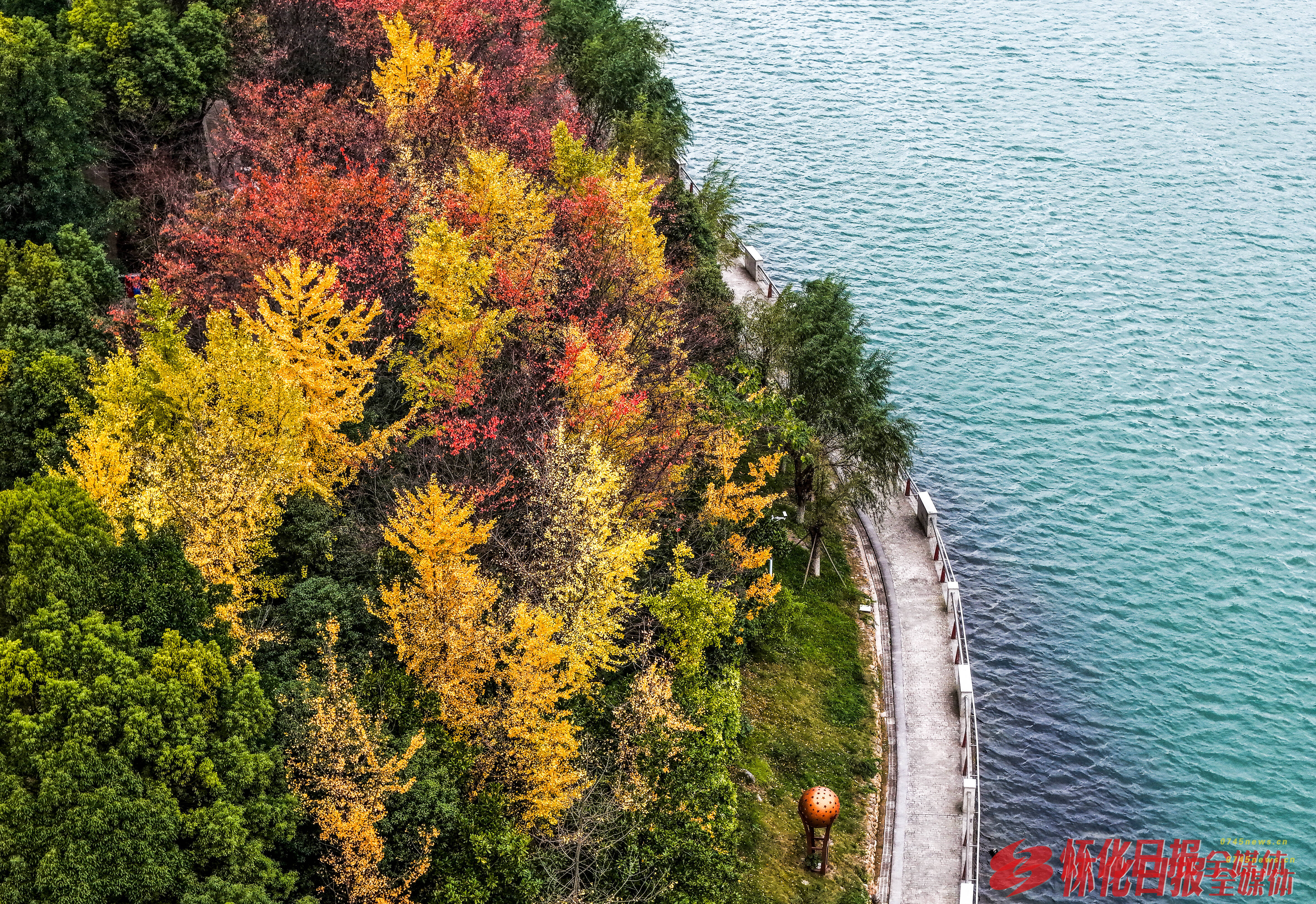 (11月18日上午,怀化市河西舞水二桥桥头,银杏披金,栾树燃红,双色交织蔓延,勾勒出绚烂多姿的初冬画卷。以上图片均由怀化日报全媒体记者 潘雨 摄)
