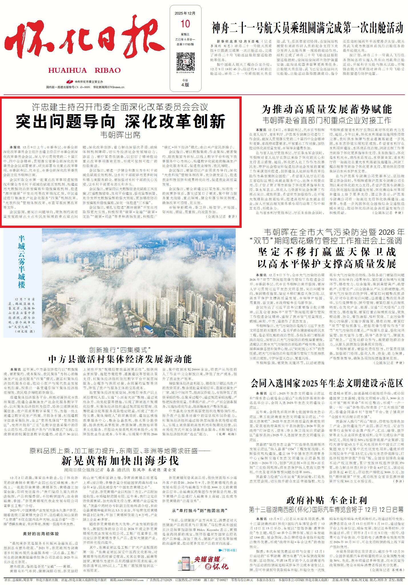 怀化日报全媒体讯12月9日上午,市委书记、市委全面深化改革委员会主任许忠建主持召开市委全面深化改革委员会会议,深入学习贯彻党的二十届三中、四中全会精神,贯彻落实省委全面深化改革委员会会议部署要求,研究部署有关重点改革事项。市委副书记、代市长、市委全面深化改革委员会副主任韦朝晖出席。