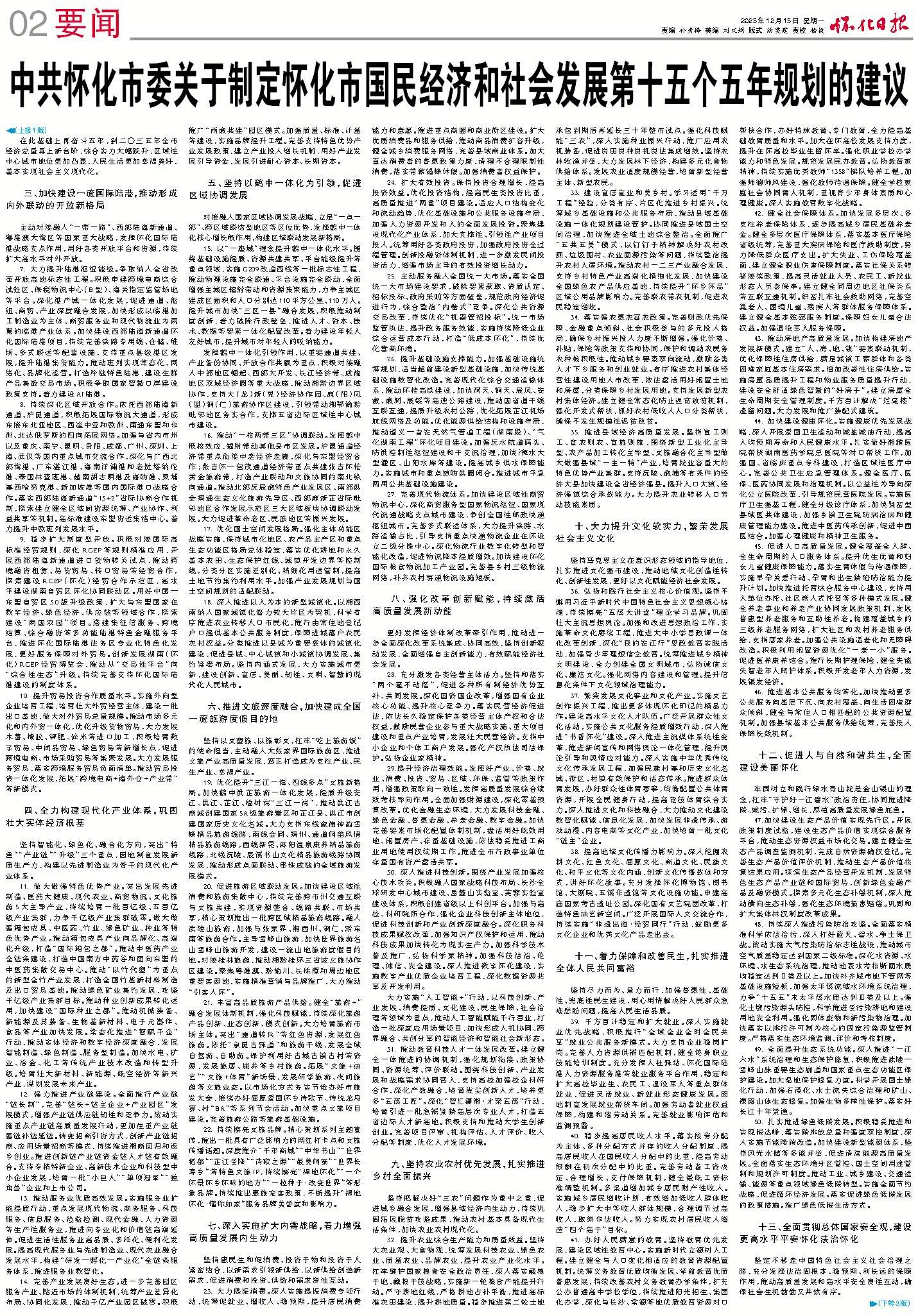 中国共产党怀化市第六届委员会第十次全体会议认真贯彻落实党的二十届四中全会精神、省委十二届九次全会精神,深入分析我市经济社会发展形势任务,就制定怀化市国民经济和社会发展“十五五”规划提出以下建议。