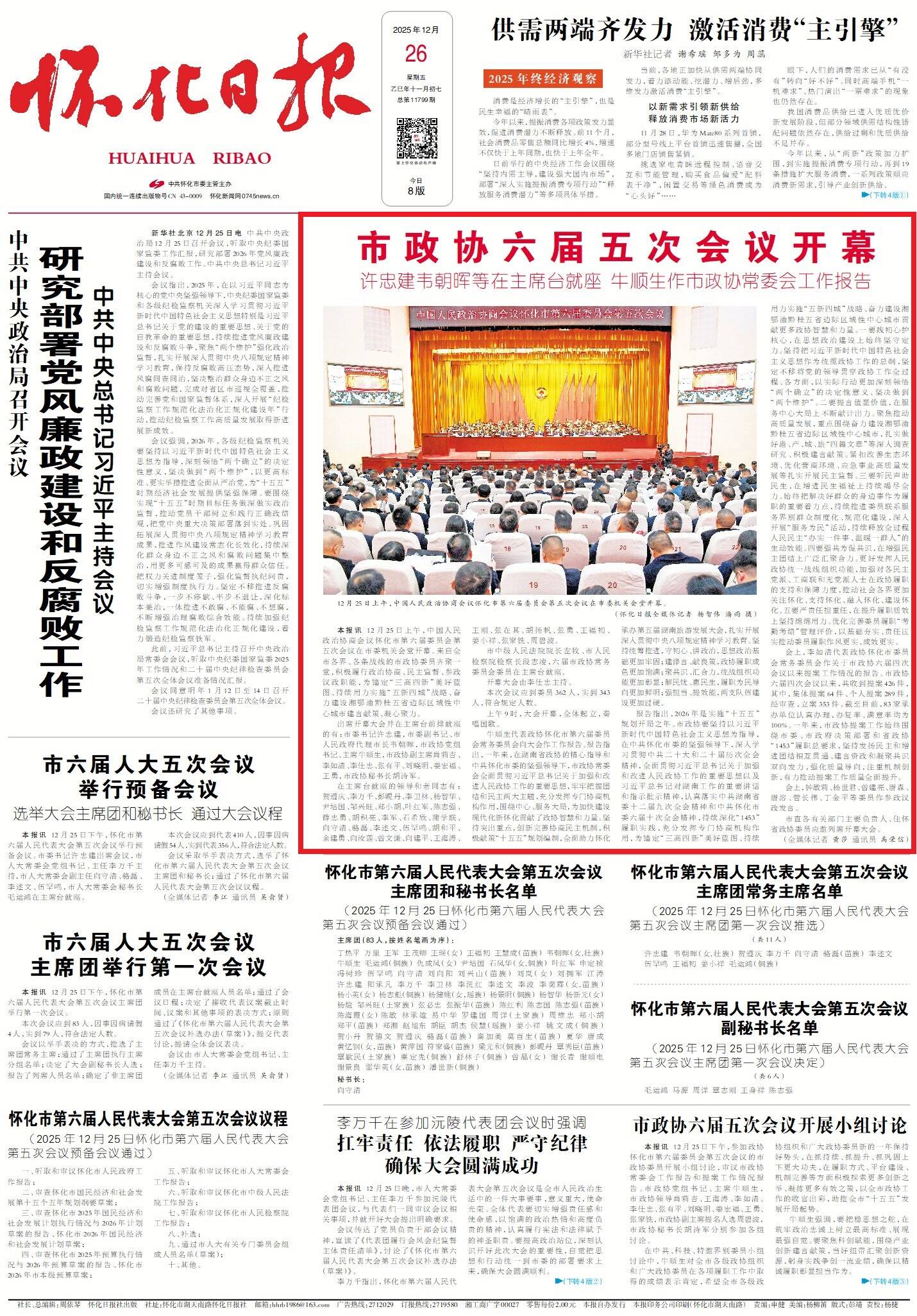 怀化日报全媒体讯12月25日上午,中国人民政治协商会议怀化市第六届委员会第五次会议在市委机关会堂开幕。来自全市各界、各条战线的市政协委员齐聚一堂,积极履行政治协商、民主监督、参政议政职能,为锚定“三高四新”美好蓝图、持续用力实施“五新四城”战略、奋力建设湘鄂渝黔桂五省边际区域性中心城市建言献策、凝心聚力。