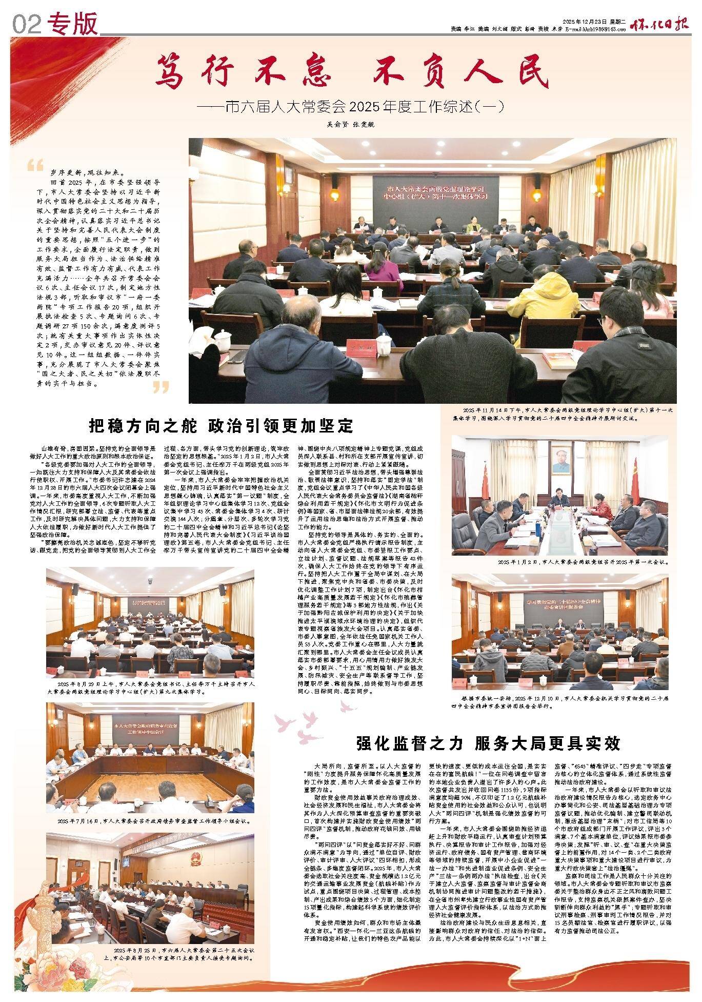 回首2025年,在市委坚强领导下,市人大常委会坚持以习近平新时代中国特色社会主义思想为指导,深入贯彻落实党的二十大和二十届历次全会精神,认真落实习近平总书记关于坚持和完善人民代表大会制度的重要思想,按照“五个进一步”的工作要求,全面履行法定职责,做到服务大局担当作为、法治供给精准有效、监督工作有力有威、代表工作充满活力……全年共召开常委会会议6次、主任会议17次,制定地方性法规3部,听取和审议市“一府一委两院”专项工作报告20项,组织开展执法检查5次、专题询问6次、专题调研27项150余次,满意度测评5次;就有关重大事项作出实体性决定2项,交办审议意见20件、评议意见10件。这一组组数据、一件件实事,充分展现了市人大常委会聚焦“国之大者、民之关切”依法履职尽责的实干与担当。