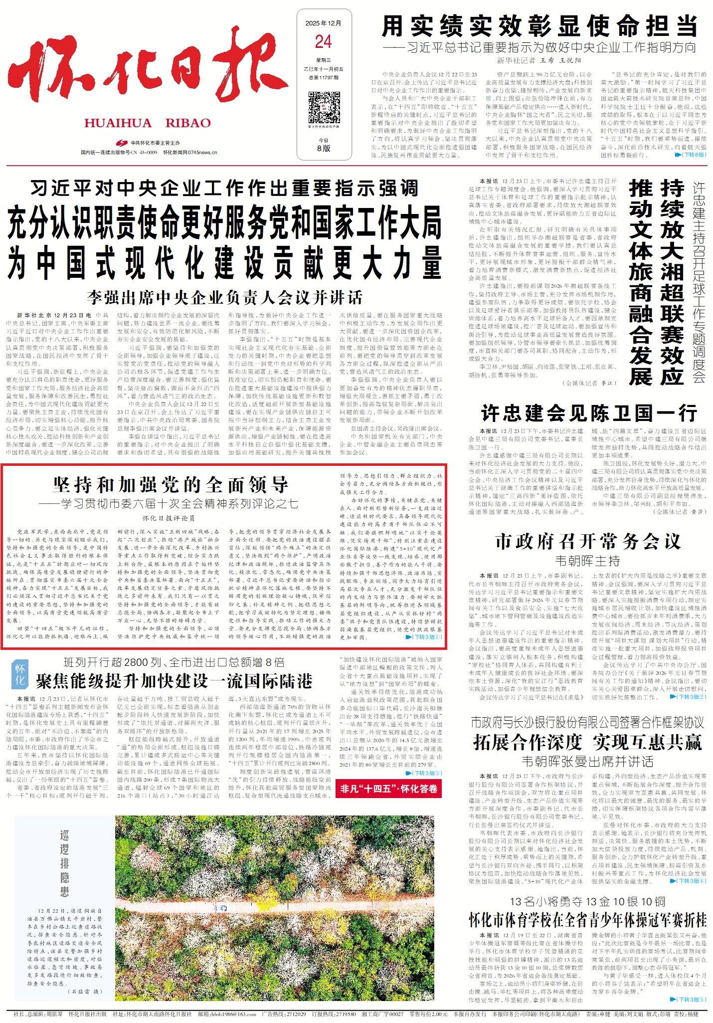 坚持和加强党的全面领导,必须坚决维护党中央权威和集中统一领导,把党的领导贯穿经济社会发展各方面全过程。要把党的政治建设摆在首位,深刻领悟“两个确立”的决定性意义、坚决做到“两个维护”,严明政治纪律和政治规矩,推进政治监督具体化、精准化、常态化,确保党中央决策部署、习近平总书记重要讲话和指示批示精神在怀化落地生根。要坚持不懈用党的创新理论凝心铸魂,筑牢信仰之基、补足精神之钙、把稳思想之舵,把学习成效转化为坚定理想、锤炼党性和指导实践、推动工作的强大力量。要充分发挥党总揽全局、协调各方的领导核心作用,不断增强党的政治领导力、思想引领力、群众组织力、社会号召力,充分调动各方面积极性,形成强大工作合力。