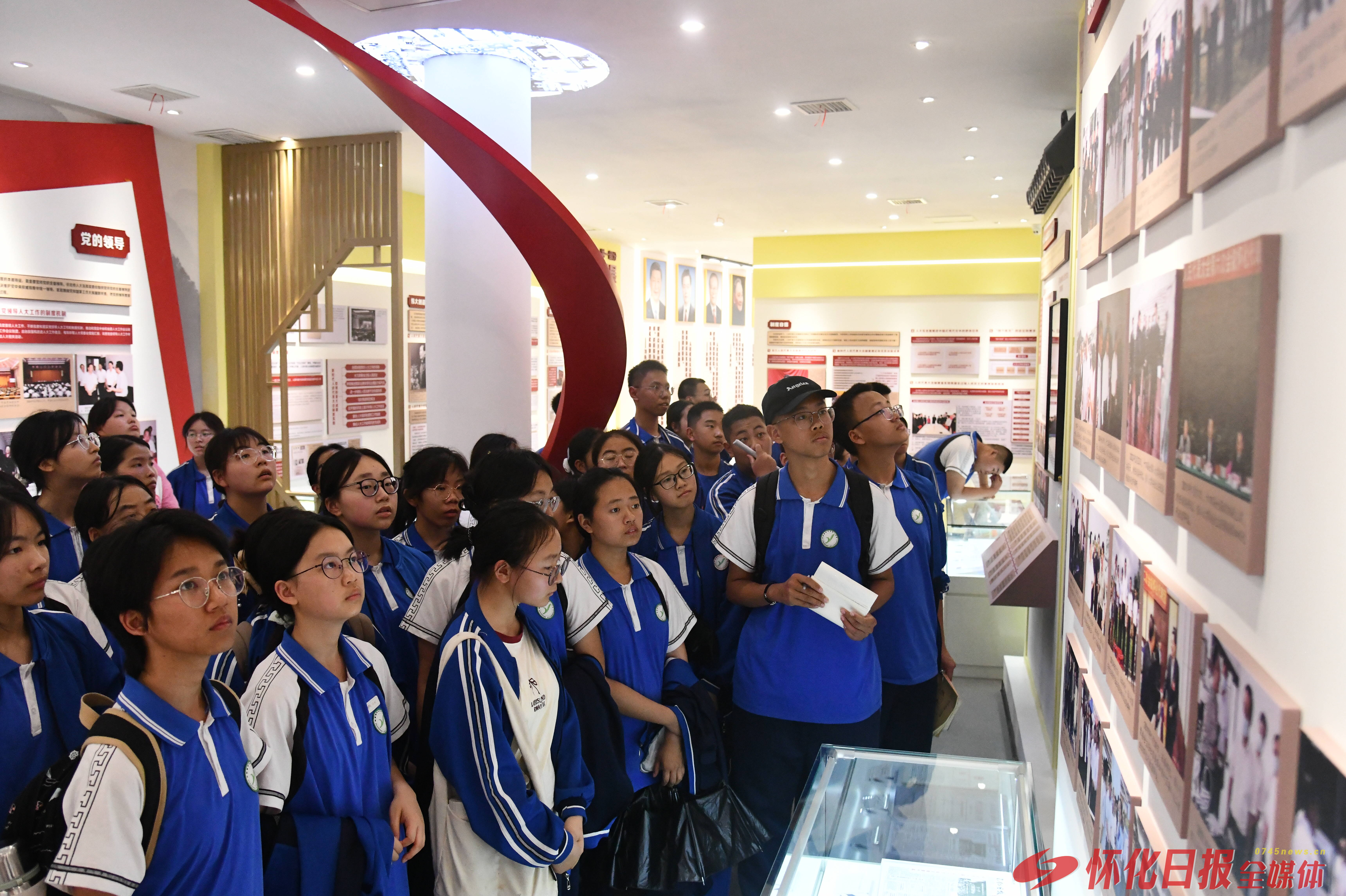 (2025年5月9日下午,怀化市一中42名高一学生走进怀化市人大常委会机关,参观人民代表大会制度怀化实践展,零距离感受全过程人民民主。)