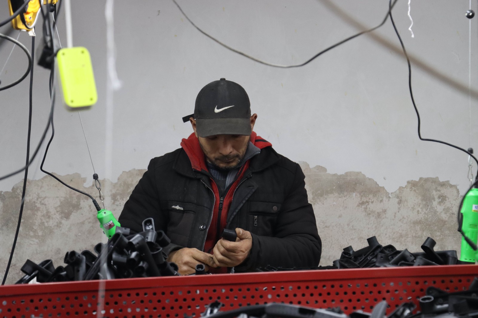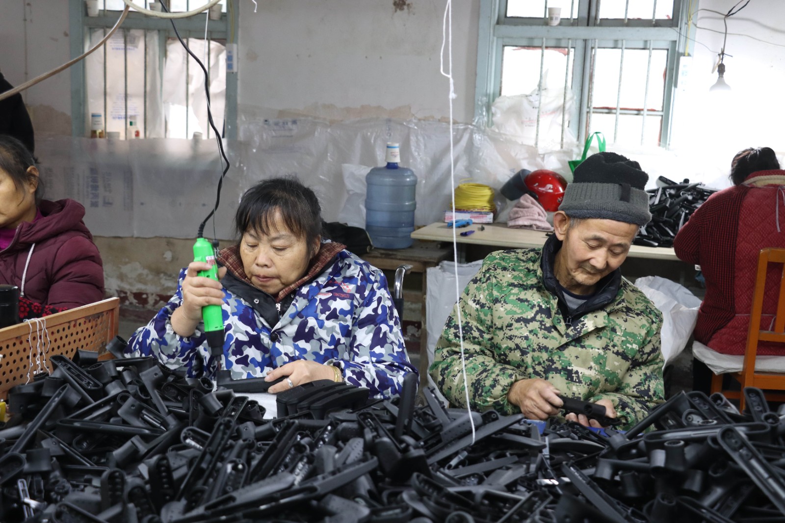 12月24日,在这个由闲置学校改造而成的箱包配件车间,日光灯管发出均匀的白光,工人们正围坐在车间中央的流水线旁低头忙碌,每个人面前都堆着黑色的箱包把手和螺丝,整个空间里,最清晰的声音是螺丝刀与金属碰撞发出的、密集而轻快的“嗒嗒”声。