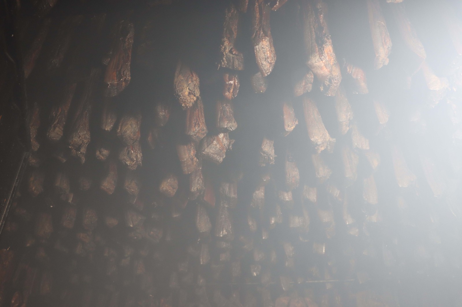 12月1日,记者走进若水镇架坪村的会同县特农赶集腊味坊,阵阵浓郁的肉香混合着木柴的清香扑面而来,一排排色泽红亮、肥瘦相间的腊肉腊味悬挂在烤房内,在柏木、松木的慢火熏制下逐渐染上琥珀色。