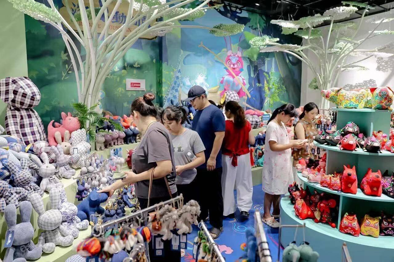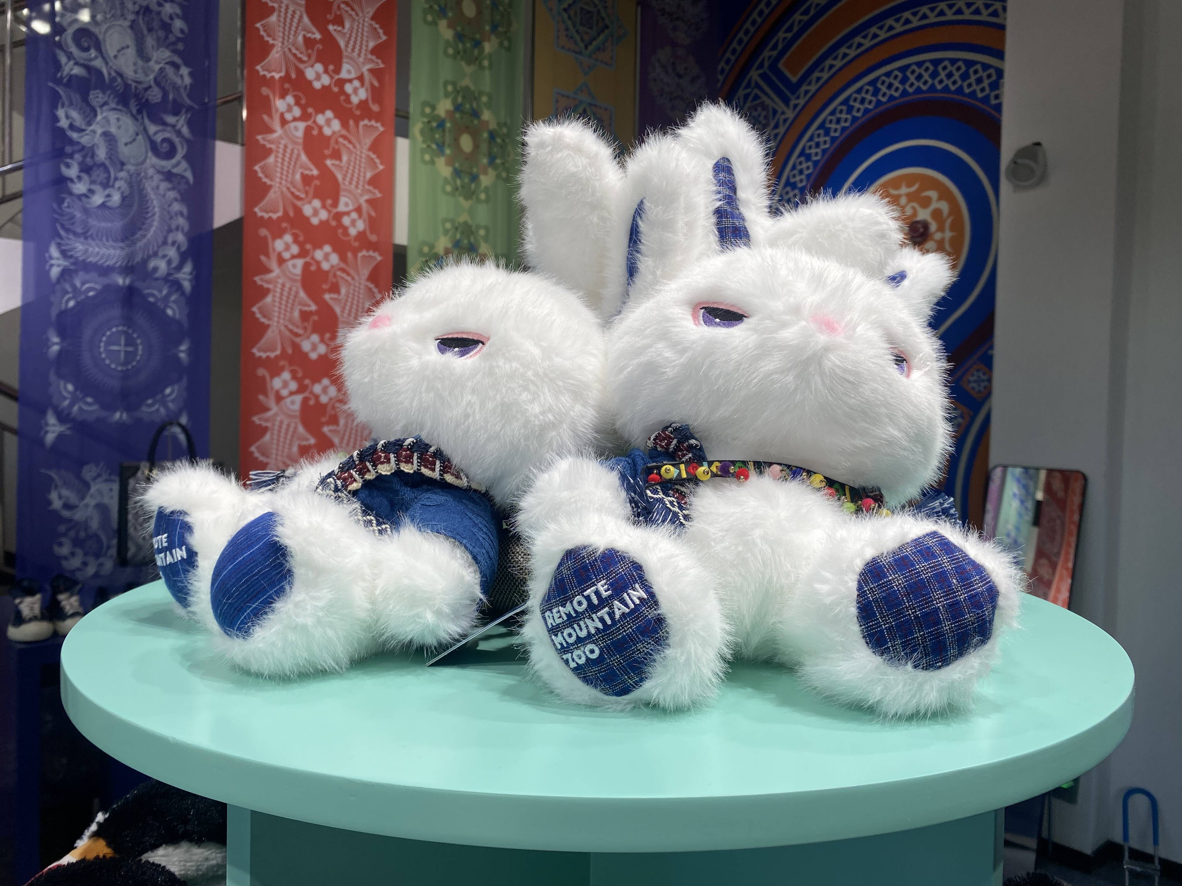 在“深山动物园”分区,各种印有非遗元素的动物造型的玩偶依次摆开,非遗含量爆表。店员杨秋告诉记者:“ ‘AI花小兔’的雪白色玩偶是我们店的销量爆款,它的双耳绣有侗锦经典的‘万’字纹,游客还可以通过智能语音和它进行实时对话。”