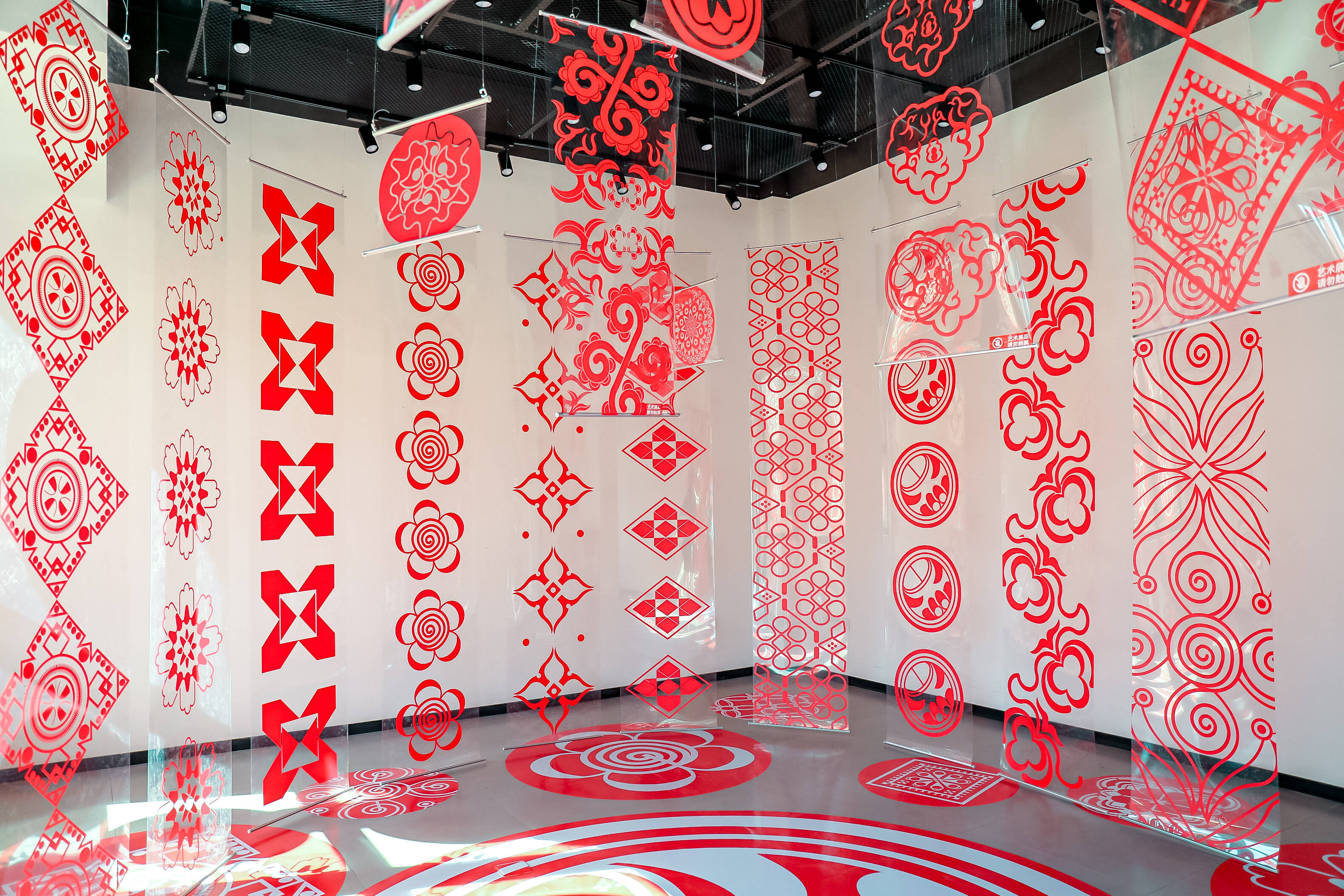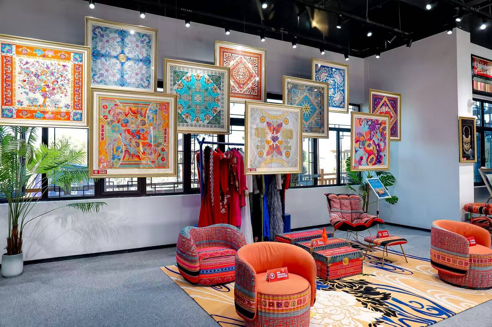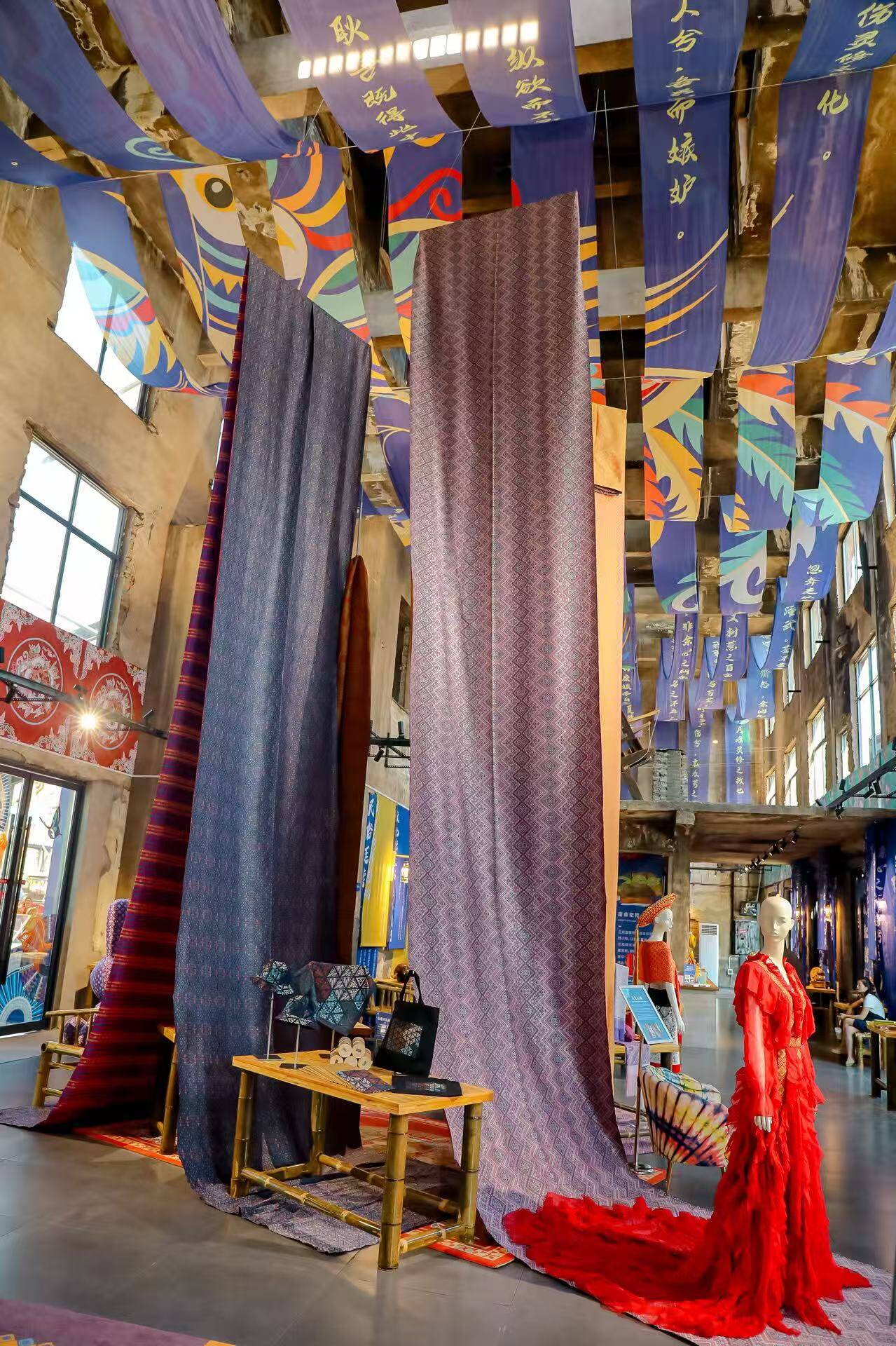 在侗锦织造技艺展示区,几道靛紫、金黄、湛蓝交织的侗锦,从挑高的大厅顶端垂落,形成了“飞流直下三千尺”的“瀑布”之势。阳光穿过侗锦,在地面投下流动变幻的光影。天花板上,轻纱吊幔写满了屈原的楚辞诗句,为集市增添了几分清雅古韵。