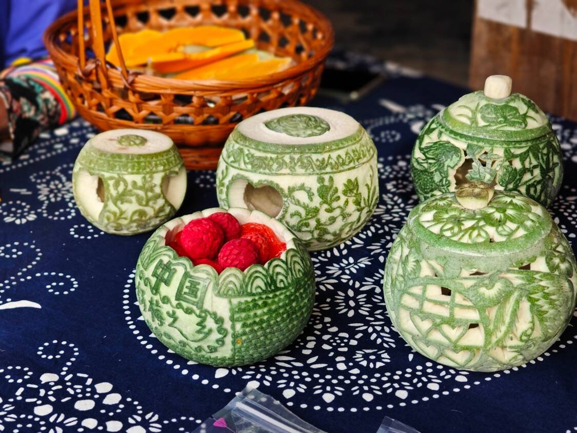 “冬瓜、南瓜和柚子都是好食材,经过选材、雕刻、腌酿等多道工序,最终形成靖州雕花蜜饯。”听着传承人的现场讲解示范,游客们围在制作台旁跃跃欲试,切片、雕花,勾勒图案一气呵成。