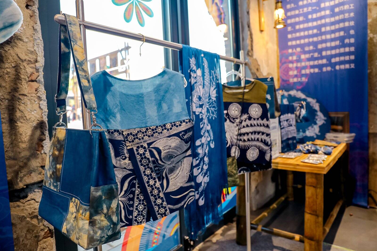 (图为蓝印花布印染的衣服、包包、围巾等。怀化日报全媒体记者 罗单摄)