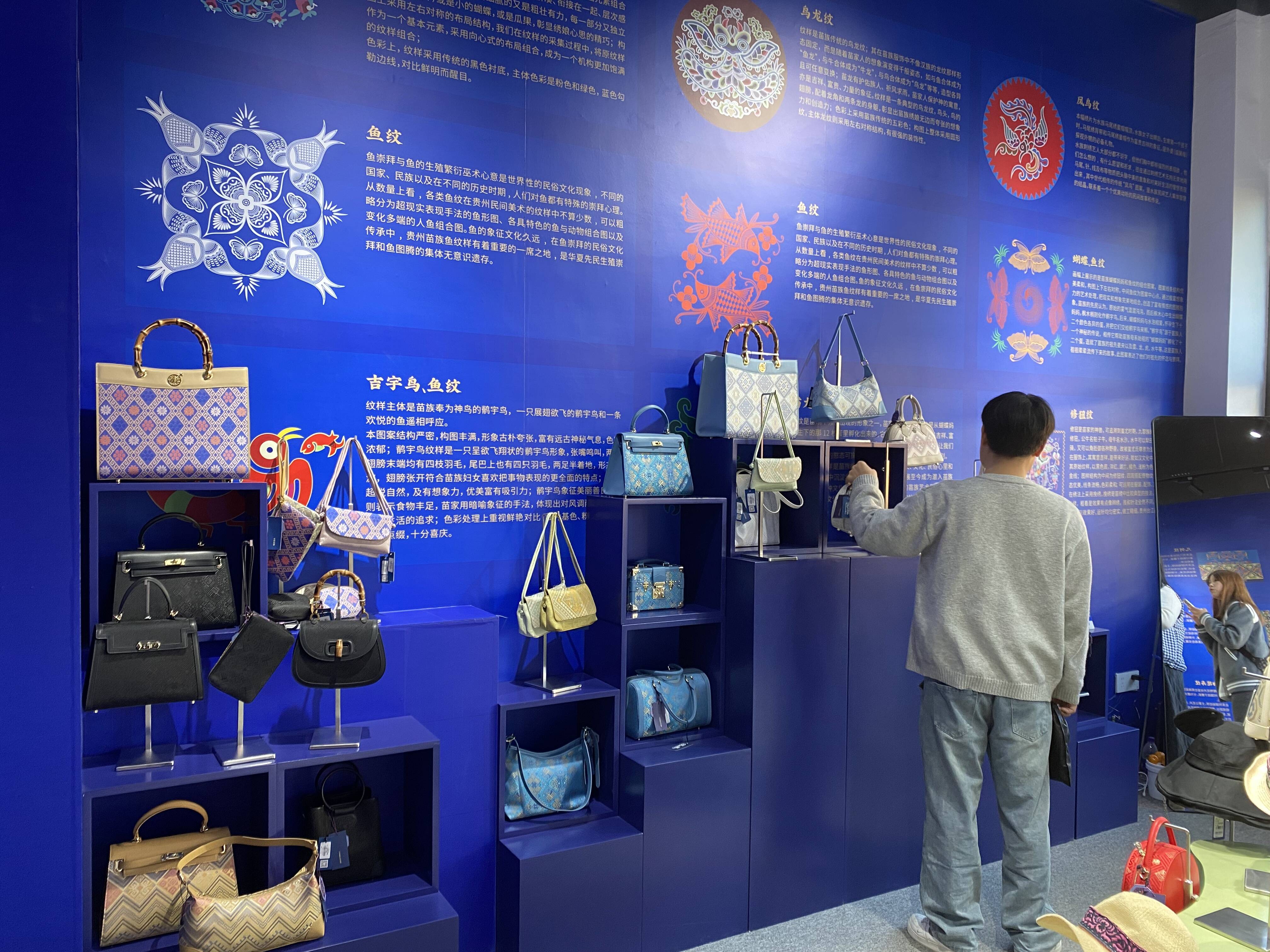 在“深山文创产品”区, 各式各样的文创产品琳琅满目,印着有辰州剪纸图案的布包、融入侗锦纹样的家居抱枕,蓝印花布缝制的桌布....... 这些设计精巧,彰显个性的非遗文创产品,将本土传统纹样与当代生活无缝衔接,深受年轻人的追捧,成为可带走的 “怀化记忆”。