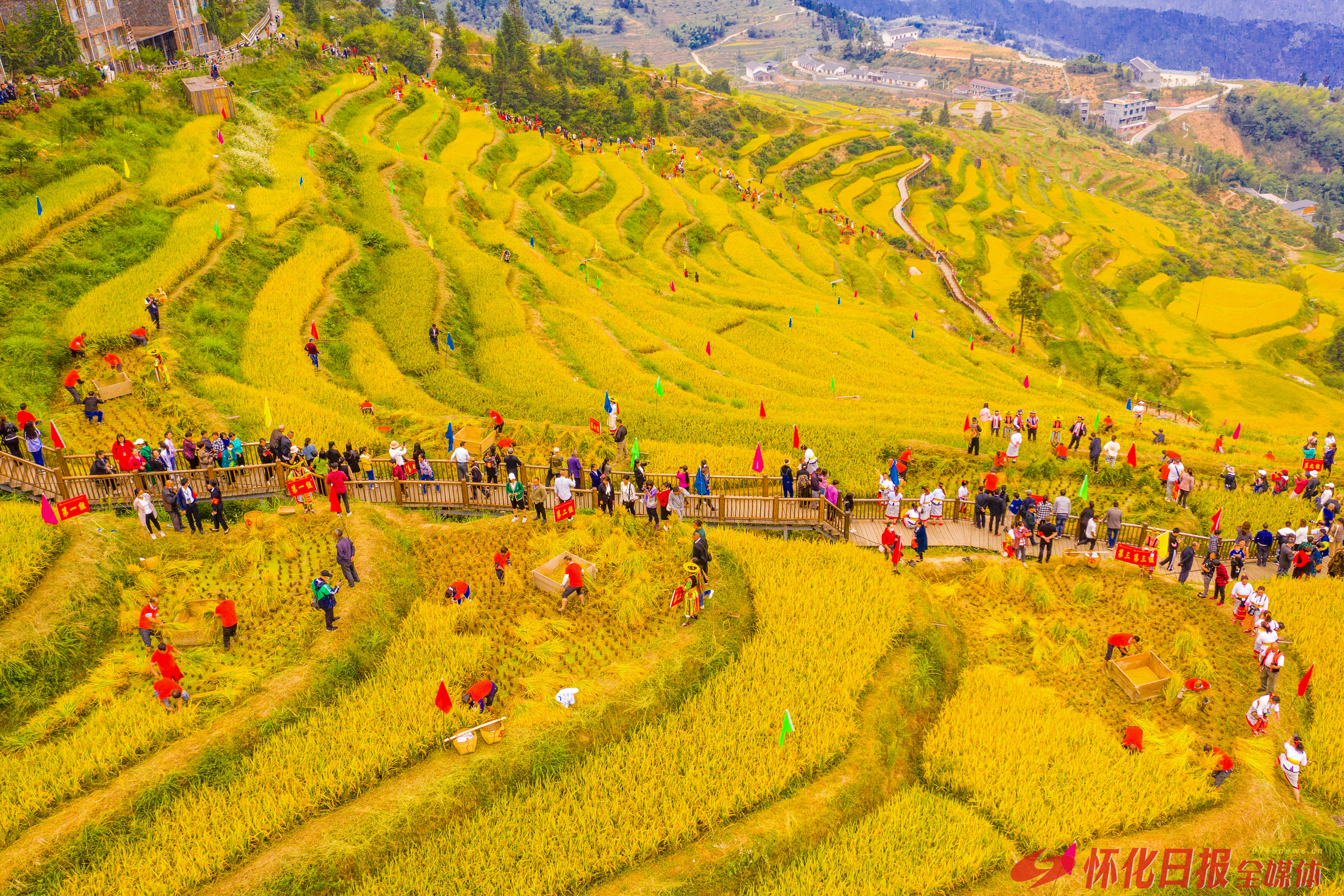 (溆浦山背梯田一片丰收景象。全媒体记者 潘雨 摄)